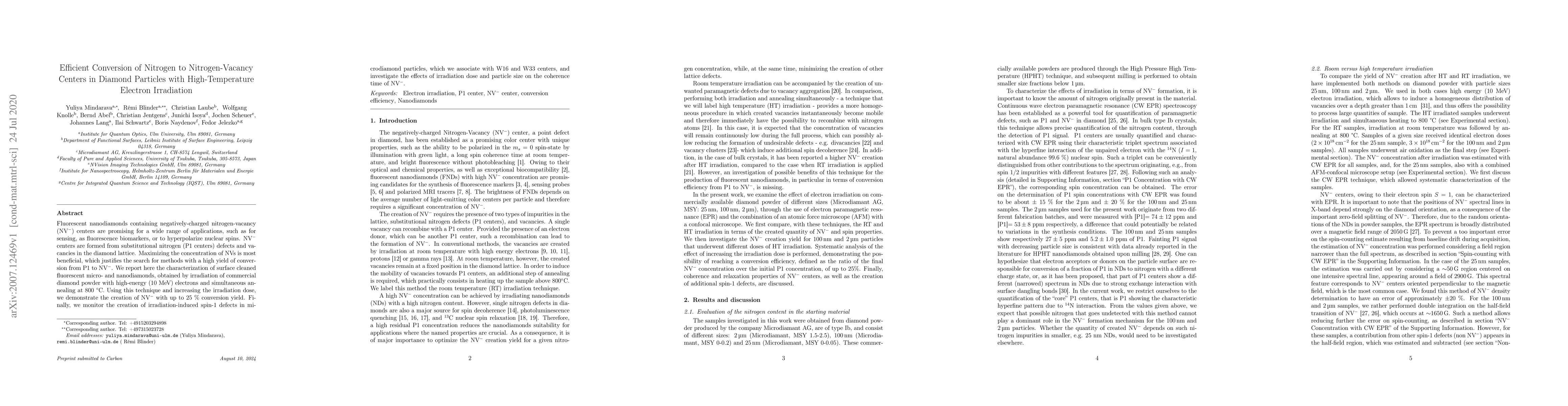 This paper reports a method for efficiently converting nitrogen substitutional defects into nitrogen-vacancy centers (NV$^-$) in diamond particles using high-temperature electron irradiation, achieving up to 25% conversion yield. The study also investigates the impact of irradiation dose and particle size on the coherence time of NV$^-$ centers and identifies additional spin-1 defects.