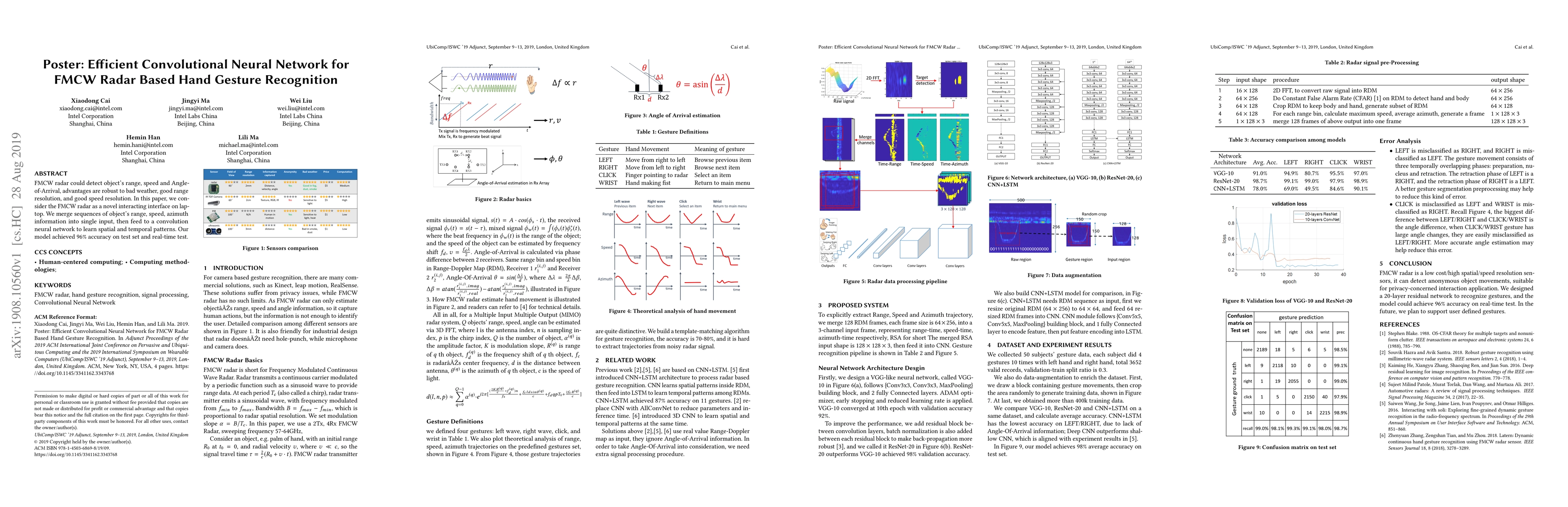 This paper proposes a convolutional neural network for recognizing hand gestures using FMCW radar data, merging range, speed, and azimuth information into a single input. The model achieves 96% accuracy on test and real-time gesture recognition.