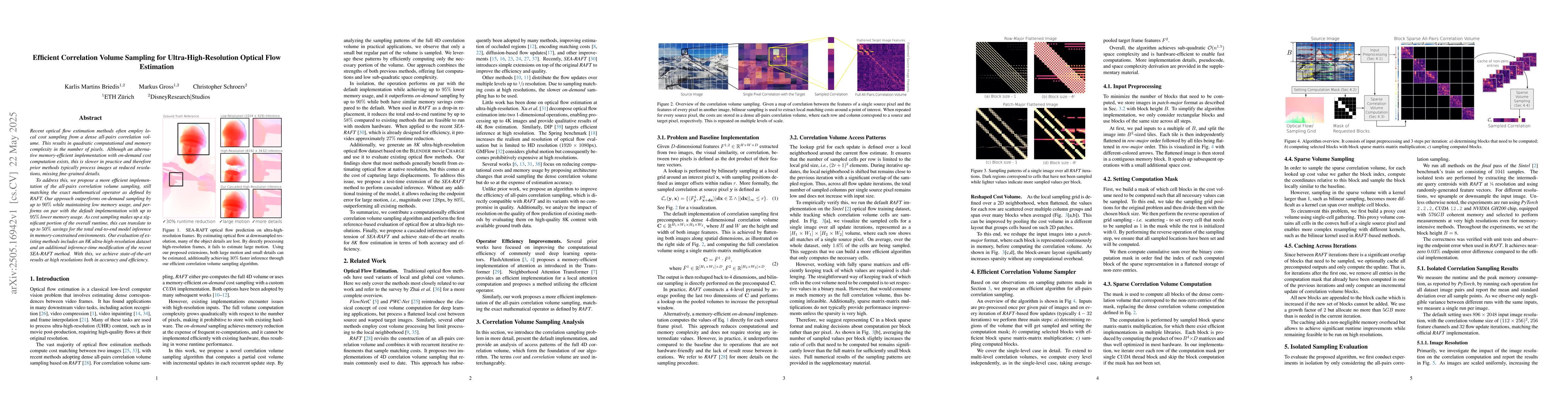 The paper presents an efficient sampling technique for correlation volumes in optical flow estimation, significantly reducing memory usage without compromising accuracy.