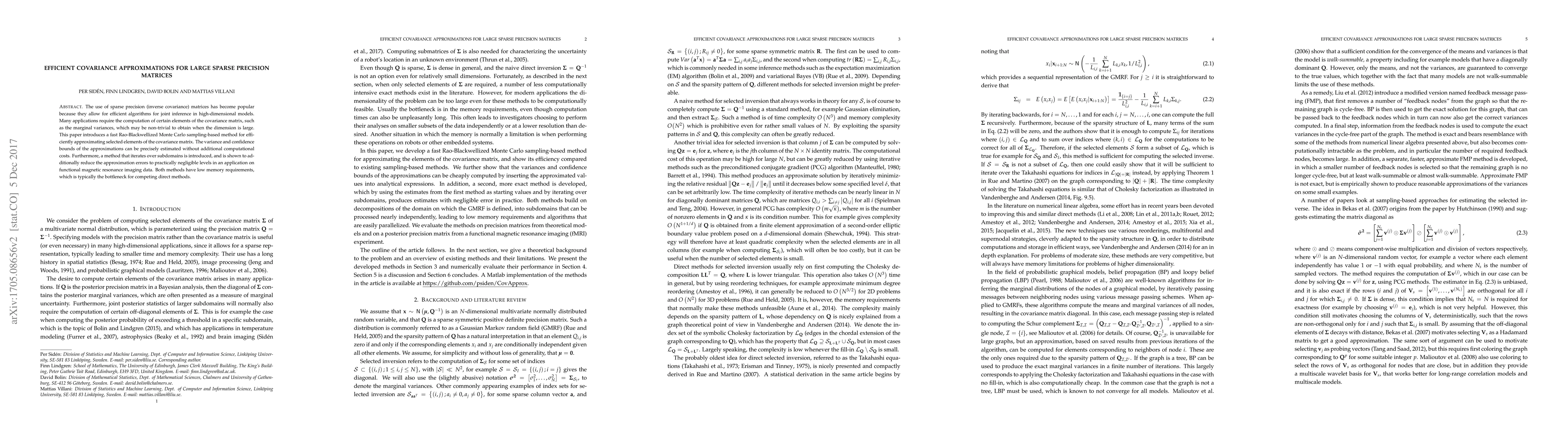 This paper proposes efficient methods for approximating selected elements of large sparse precision matrices using Rao-Blackwellized Monte Carlo sampling, with precise variance and confidence bounds, and introduces an iterative subdomain approach to reduce errors, all with low memory requirements. The methods are demonstrated on functional magnetic resonance imaging data.