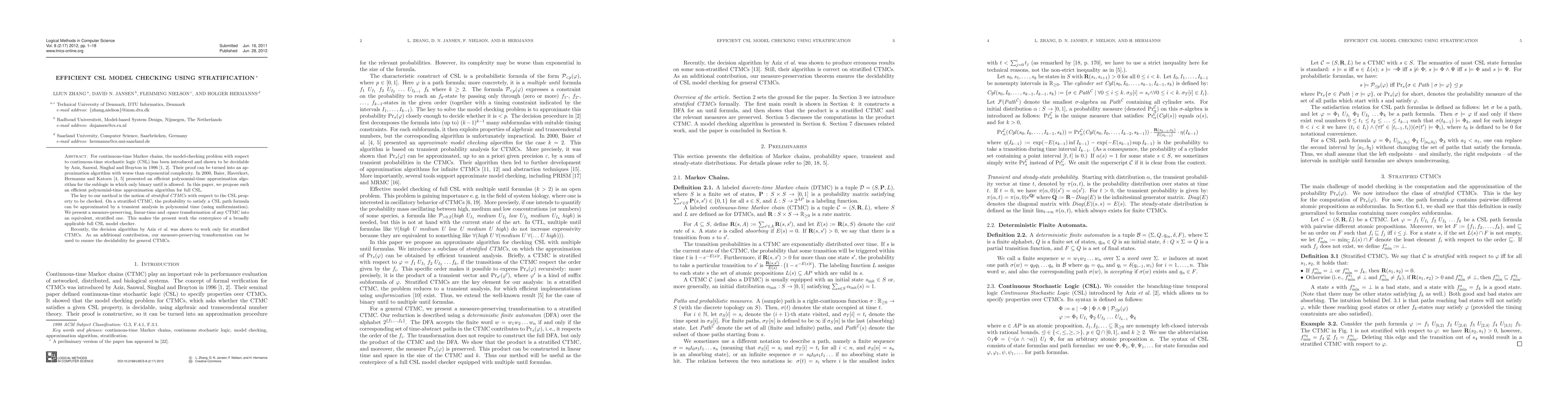 This paper proposes an efficient polynomial-time approximation algorithm for full continuous-time stochastic logic (CSL) model checking using stratified continuous-time Markov chains (CTMCs). The authors introduce a linear-time transformation to convert any CTMC into a stratified one, enabling polynomial-time transient analysis.