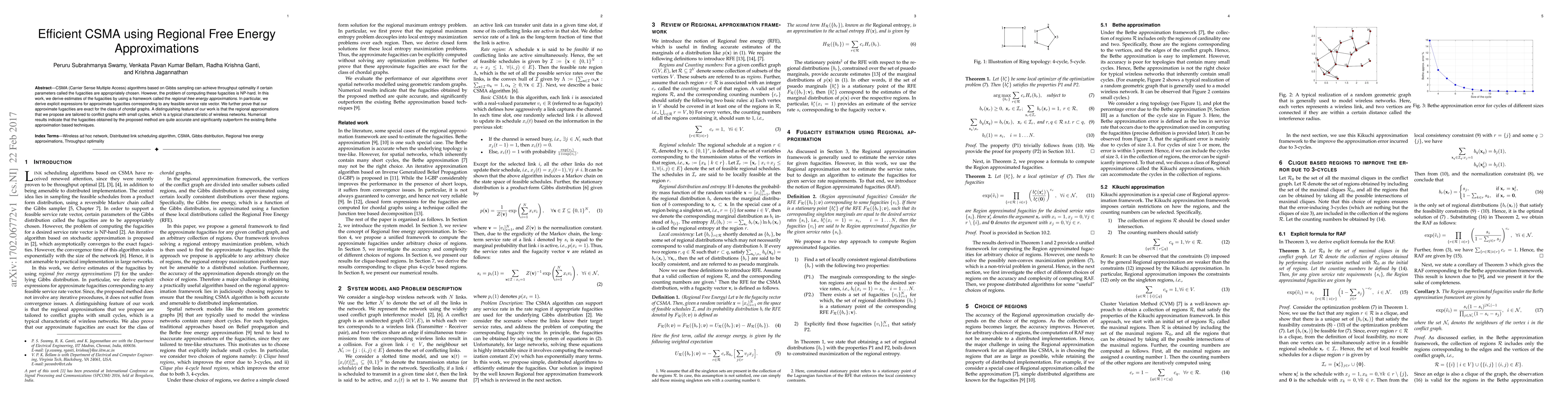 CSMA (Carrier Sense Multiple Access) algorithms based on Gibbs sampling can achieve throughput optimality if certain parameters called the fugacities are appropriately chosen. However, the problem of computing these fugacities is NP-hard. In this work, we derive estimates of the fugacities by using a framework called the regional free energy approximations. In particular, we derive explicit expressions for approximate fugacities corresponding to any feasible service rate vector. We further prove that our approximate fugacities are exact for the class of chordal graphs. A distinguishing feature of our work is that the regional approximations that we propose are tailored to conflict graphs with small cycles, which is a typical characteristic of wireless networks. Numerical results indicate that the fugacities obtained by the proposed method are quite accurate and significantly outperform the existing Bethe approximation based techniques.