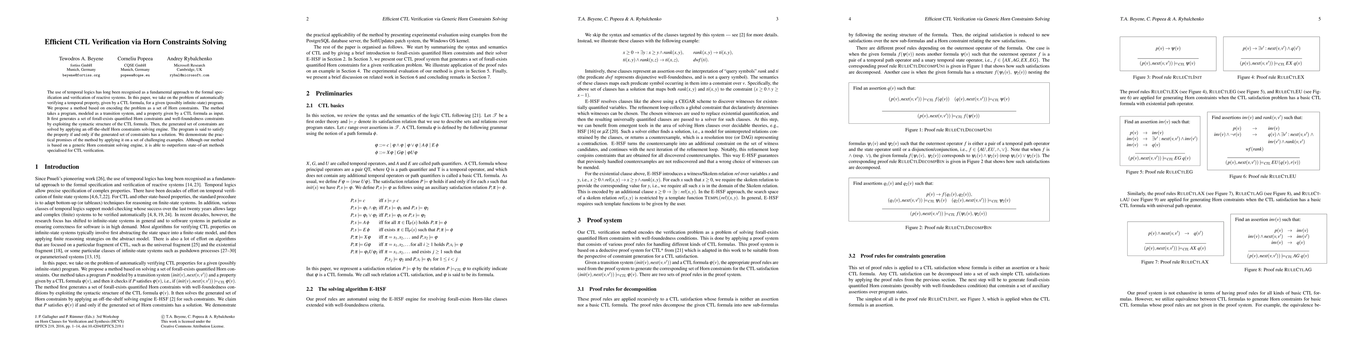This paper proposes a novel method for CTL verification by encoding the problem as Horn constraints, which are then solved using an off-the-shelf solver. The method outperforms specialized CTL verification techniques, demonstrating practical effectiveness on challenging examples.