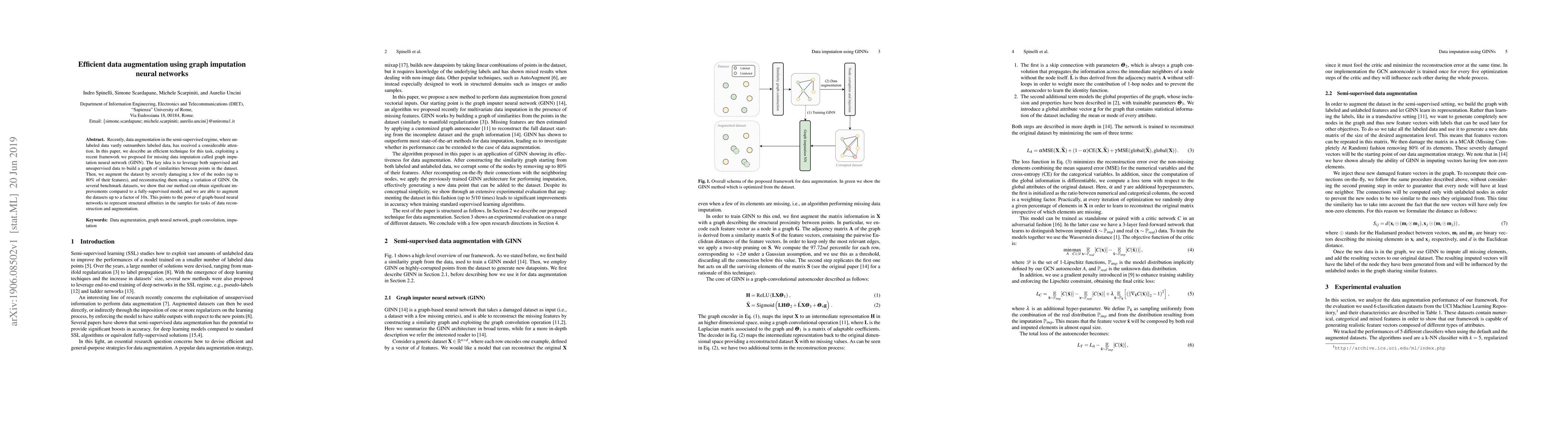 This paper proposes an efficient data augmentation technique using graph imputation neural networks (GINN) in semi-supervised learning. By leveraging both labeled and unlabeled data to construct a similarity graph, the method damages and reconstructs a large portion of dataset features, achieving significant improvements over fully-supervised models and enabling up to 10x dataset augmentation.