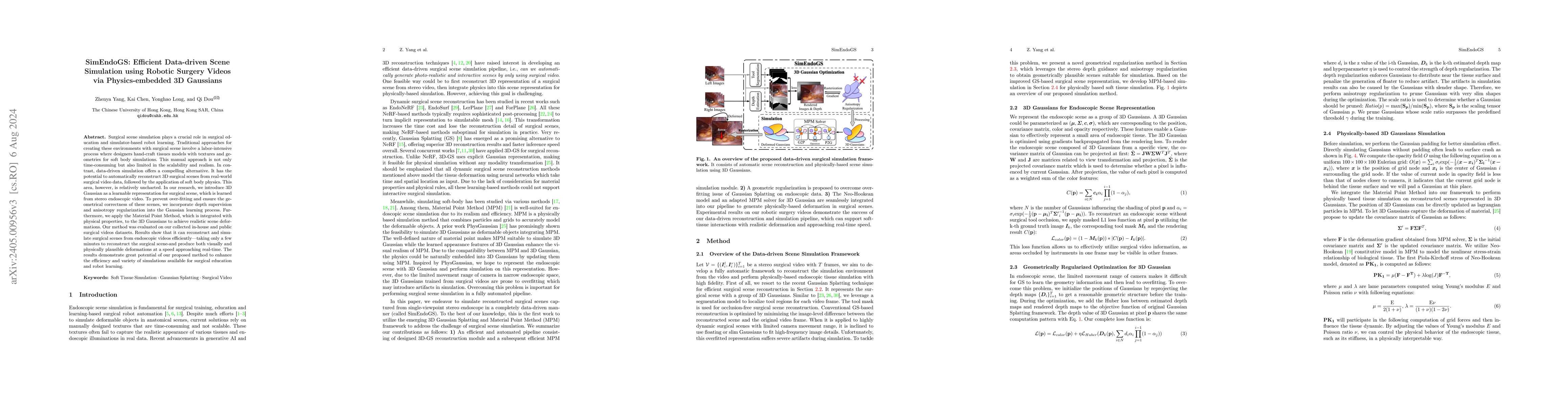 This research presents a novel data-driven approach to efficiently simulate surgical scenes from robotic surgery videos using physics-embedded 3D Gaussians, achieving realistic deformations in real-time. The method incorporates depth supervision and anisotropy regularization to ensure geometrical correctness and uses the Material Point Method for realistic soft tissue simulations.