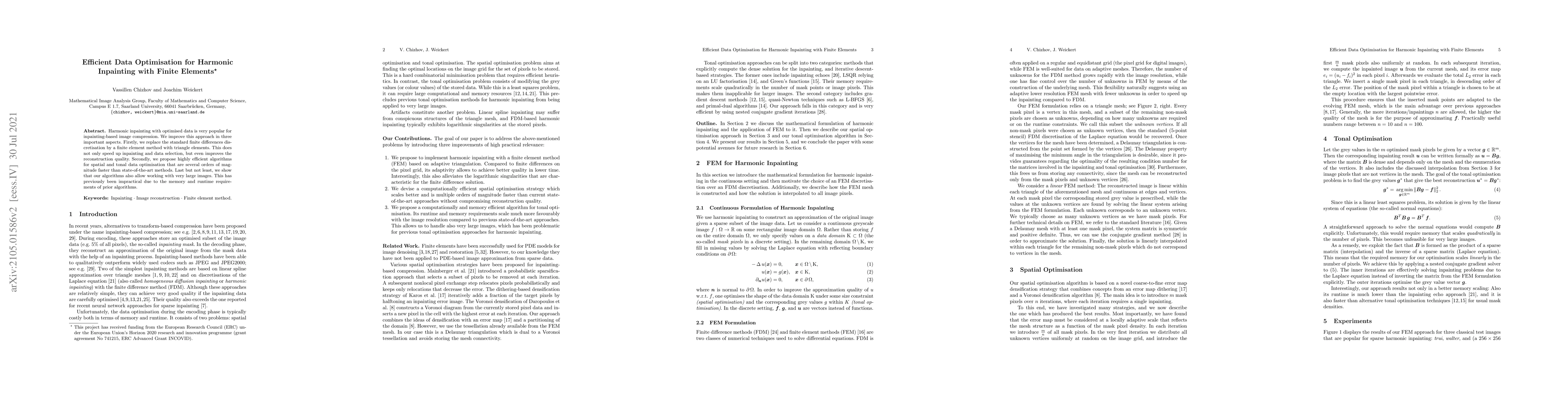 This paper enhances harmonic inpainting with optimised data using finite element methods, which accelerates inpainting and improves reconstruction quality. It also introduces efficient algorithms for spatial and tonal data optimisation, significantly outperforming existing methods, and enables the processing of large images previously deemed impractical.