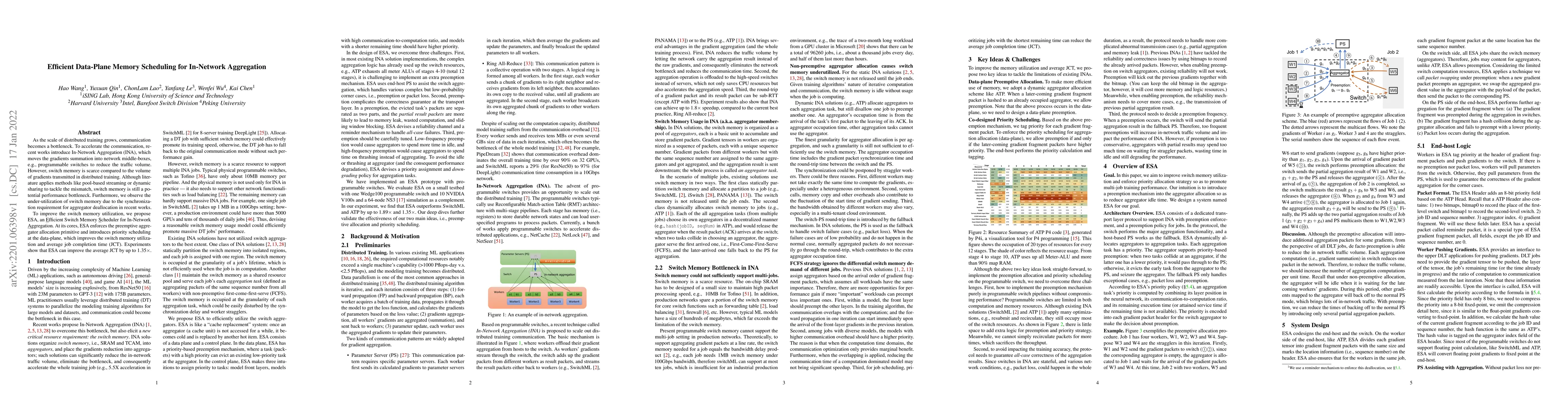 As the scale of distributed training grows, communication becomes a bottleneck. To accelerate the communication, recent works introduce In-Network Aggregation (INA), which moves the gradients summation into network middle-boxes, e.g., programmable switches to reduce the traffic volume. However, switch memory is scarce compared to the volume of gradients transmitted in distributed training. Although literature applies methods like pool-based streaming or dynamic sharing to tackle the mismatch, switch memory is still a potential performance bottleneck. Furthermore, we observe the under-utilization of switch memory due to the synchronization requirement for aggregator deallocation in recent works. To improve the switch memory utilization, we propose ESA, an $\underline{E}$fficient Switch Memory $\underline{S}$cheduler for In-Network $\underline{A}$ggregation. At its cores, ESA enforces the preemptive aggregator allocation primitive and introduces priority scheduling at the data-plane, which improves the switch memory utilization and average job completion time (JCT). Experiments show that ESA can improve the average JCT by up to $1.35\times$.