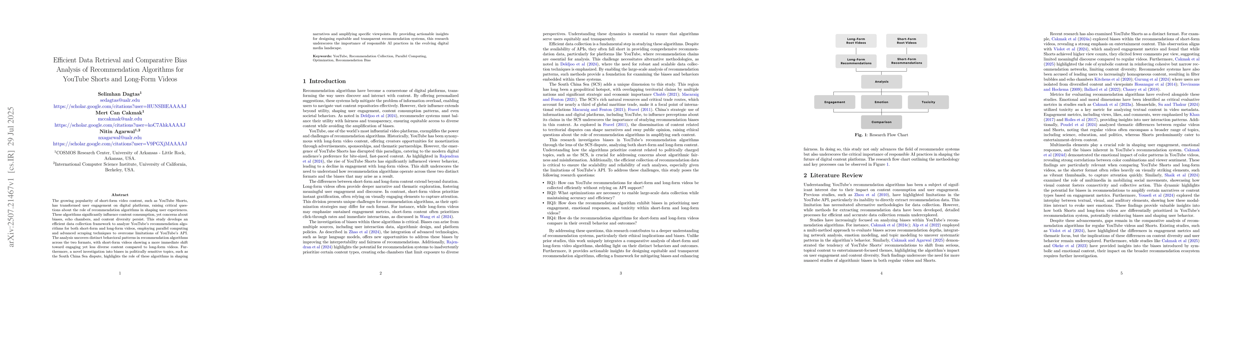 The growing popularity of short-form video content, such as YouTube Shorts, has transformed user engagement on digital platforms, raising critical questions about the role of recommendation algorithms in shaping user experiences. These algorithms significantly influence content consumption, yet concerns about biases, echo chambers, and content diversity persist. This study develops an efficient data collection framework to analyze YouTube's recommendation algorithms for both short-form and long-form videos, employing parallel computing and advanced scraping techniques to overcome limitations of YouTube's API. The analysis uncovers distinct behavioral patterns in recommendation algorithms across the two formats, with short-form videos showing a more immediate shift toward engaging yet less diverse content compared to long-form videos. Furthermore, a novel investigation into biases in politically sensitive topics, such as the South China Sea dispute, highlights the role of these algorithms in shaping narratives and amplifying specific viewpoints. By providing actionable insights for designing equitable and transparent recommendation systems, this research underscores the importance of responsible AI practices in the evolving digital media landscape.
