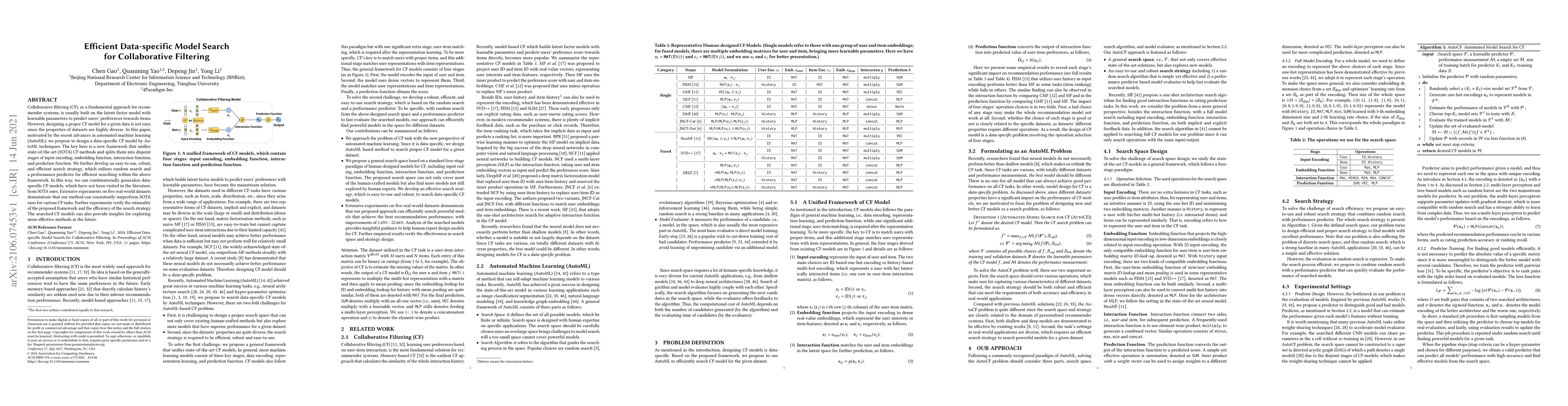 This paper proposes a data-specific model search for collaborative filtering using automated machine learning techniques, outperforming state-of-the-art methods on five real-world datasets.