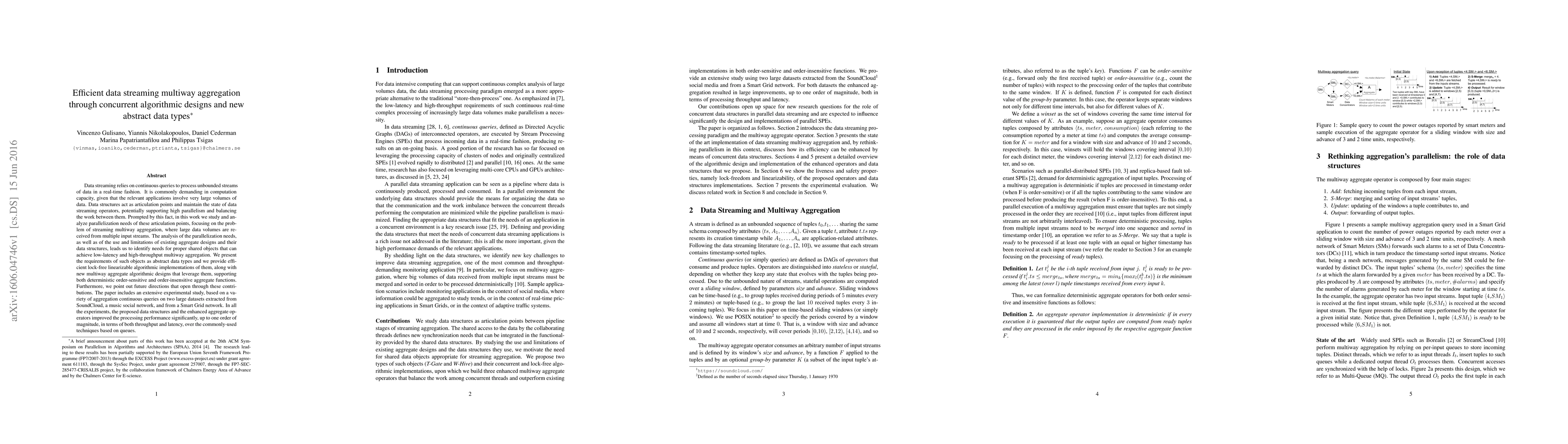 This research paper presents efficient data streaming multiway aggregation through concurrent algorithmic designs and new abstract data types, improving processing performance by up to one order of magnitude in terms of both throughput and latency.