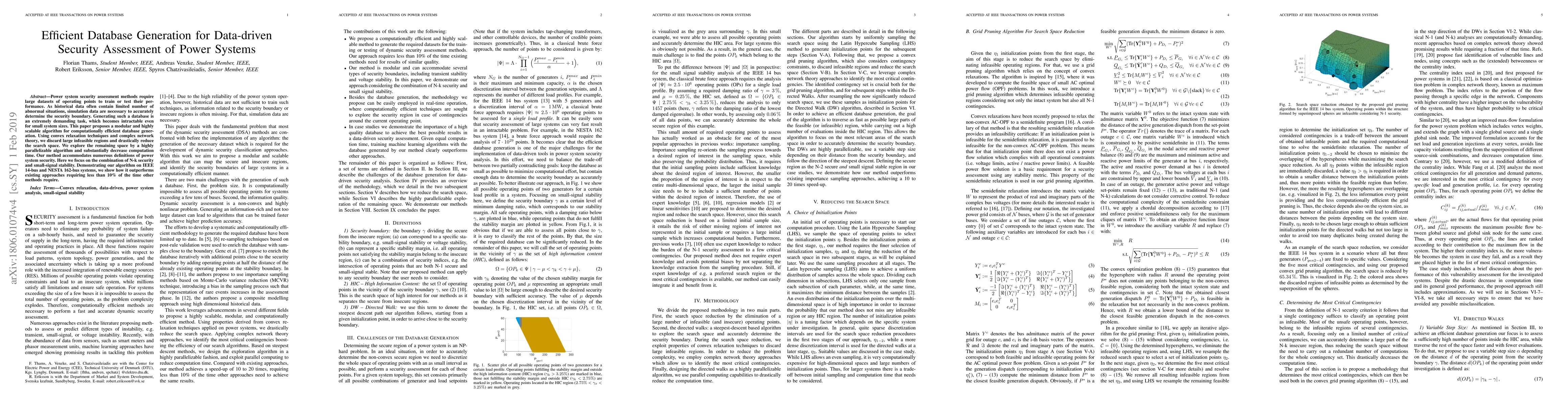 Power system security assessment methods require large datasets of operating points to train or test their performance. As historical data often contain limited number of abnormal situations, simulation data are necessary to accurately determine the security boundary. Generating such a database is an extremely demanding task, which becomes intractable even for small system sizes. This paper proposes a modular and highly scalable algorithm for computationally efficient database generation. Using convex relaxation techniques and complex network theory, we discard large infeasible regions and drastically reduce the search space. We explore the remaining space by a highly parallelizable algorithm and substantially decrease computation time. Our method accommodates numerous definitions of power system security. Here we focus on the combination of N-k security and small-signal stability. Demonstrating our algorithm on IEEE 14-bus and NESTA 162-bus systems, we show how it outperforms existing approaches requiring less than 10% of the time other methods require.