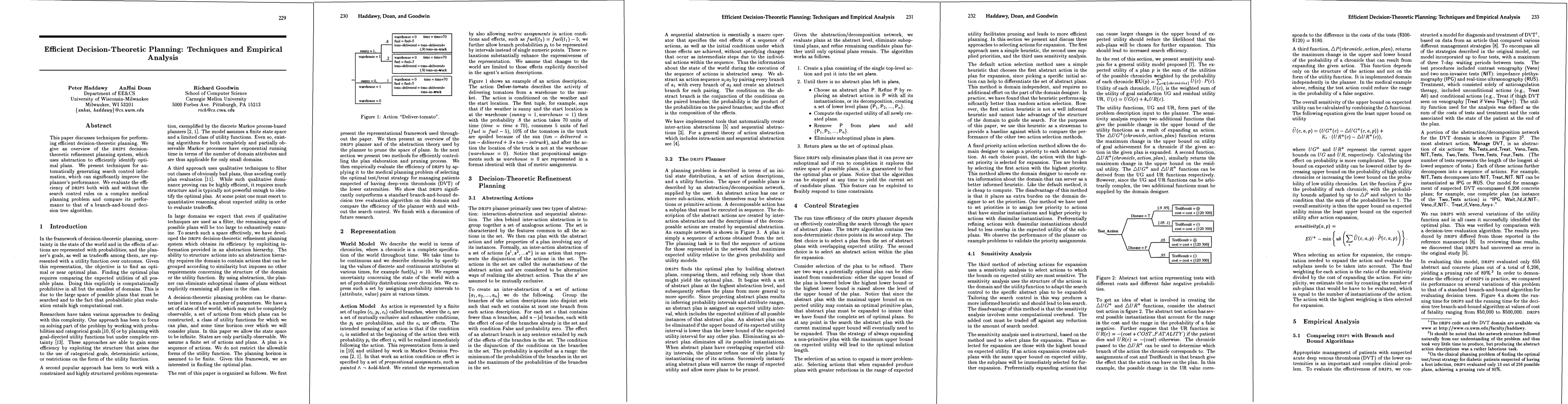 This paper introduces efficient decision-theoretic planning techniques using the DRIPS system, which leverages abstraction for optimal plan identification and automated search control information. Empirical results show improved performance on a complex medical planning problem compared to a branch-and-bound algorithm.