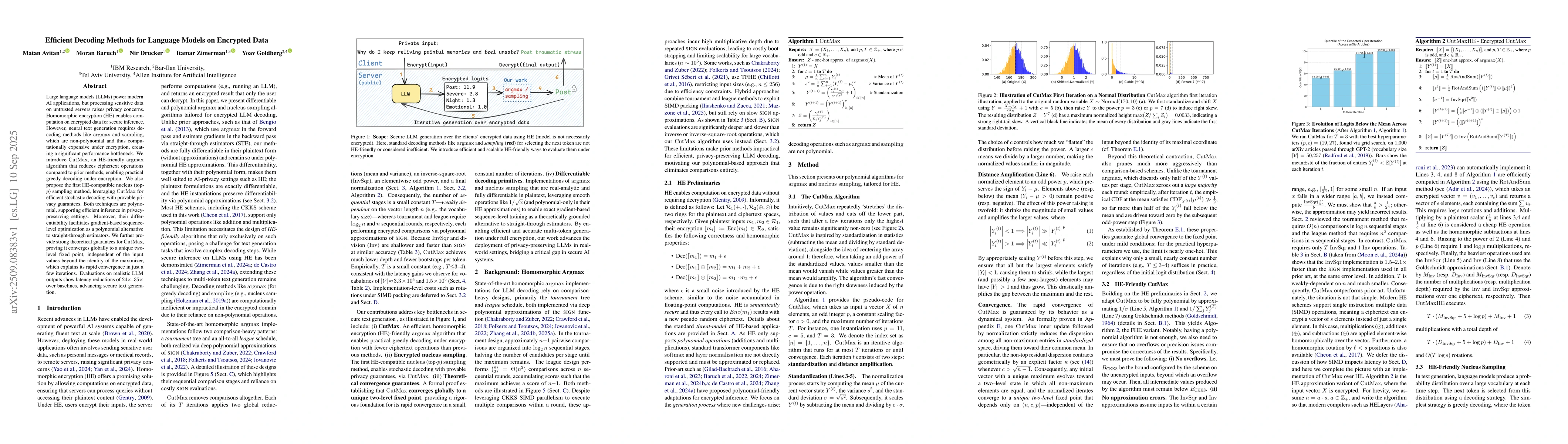 Large language models (LLMs) power modern AI applications, but processing sensitive data on untrusted servers raises privacy concerns. Homomorphic encryption (HE) enables computation on encrypted data for secure inference. However, neural text generation requires decoding methods like argmax and sampling, which are non-polynomial and thus computationally expensive under encryption, creating a significant performance bottleneck. We introduce cutmax, an HE-friendly argmax algorithm that reduces ciphertext operations compared to prior methods, enabling practical greedy decoding under encryption. We also propose the first HE-compatible nucleus (top-p) sampling method, leveraging cutmax for efficient stochastic decoding with provable privacy guarantees. Both techniques are polynomial, supporting efficient inference in privacy-preserving settings. Moreover, their differentiability facilitates gradient-based sequence-level optimization as a polynomial alternative to straight-through estimators. We further provide strong theoretical guarantees for cutmax, proving it converges globally to a unique two-level fixed point, independent of the input values beyond the identity of the maximizer, which explains its rapid convergence in just a few iterations. Evaluations on realistic LLM outputs show latency reductions of 24x-35x over baselines, advancing secure text generation.