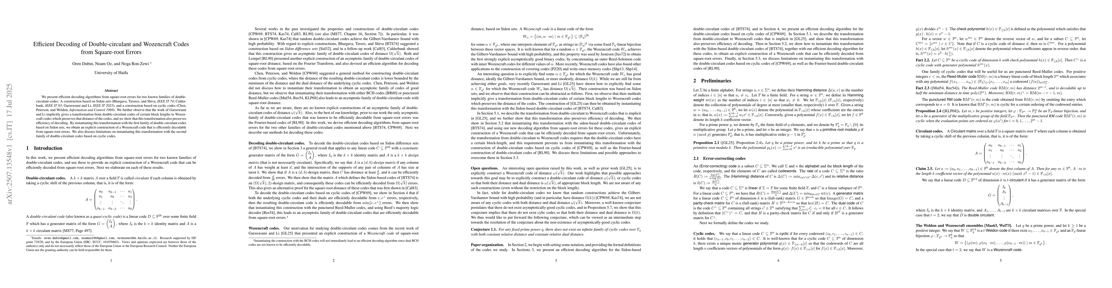 We present efficient decoding algorithms from square-root errors for two known families of double-circulant codes: A construction based on Sidon sets (Bhargava, Taveres, and Shiva, \emph{IEEE IT 74}; Calderbank, \emph{IEEE IT 83}; Guruswami and Li, \emph{IEEE IT 2025}), and a construction based on cyclic codes (Chen, Peterson, and Weldon, \emph{Information and Control 1969}). We further observe that the work of Guruswami and Li implicitly gives a transformation from double-circulant codes of certain block lengths to Wozencraft codes which preserves that distance of the codes, and we show that this transformation also preserves efficiency of decoding. By instantiating this transformation with the first family of double-circulant codes based on Sidon sets, we obtain an explicit construction of a Wozencraft code that is efficiently decodable from square-root errors. We also discuss limitations on instantiating this transformation with the second family of double-circulant codes based on cyclic codes.