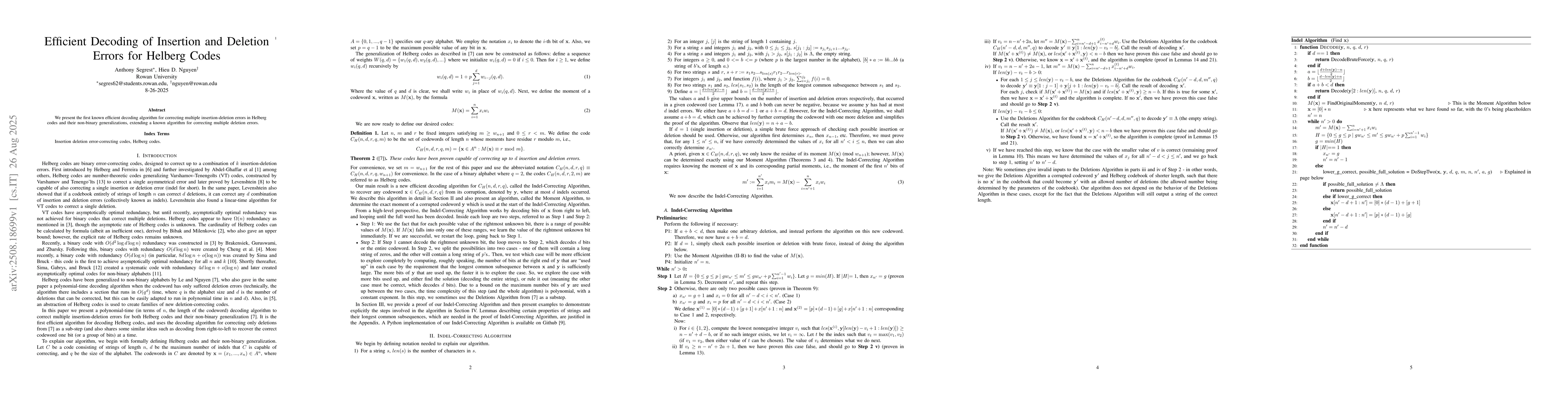 We present the first known efficient decoding algorithm for correcting multiple insertion-deletion errors in Helberg codes and their non-binary generalizations, extending a known algorithm for correcting multiple deletion errors.