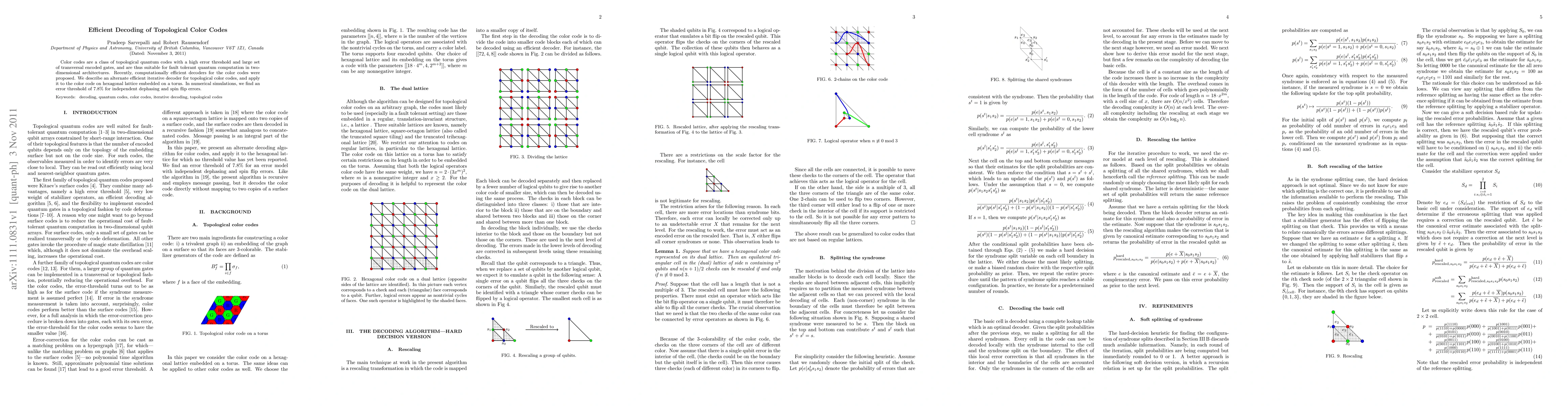 This paper proposes an efficient iterative decoder for topological color codes, particularly applied to a hexagonal lattice on a torus, achieving an error threshold of 7.8% for independent dephasing and spin flip errors, enhancing fault-tolerant quantum computation.