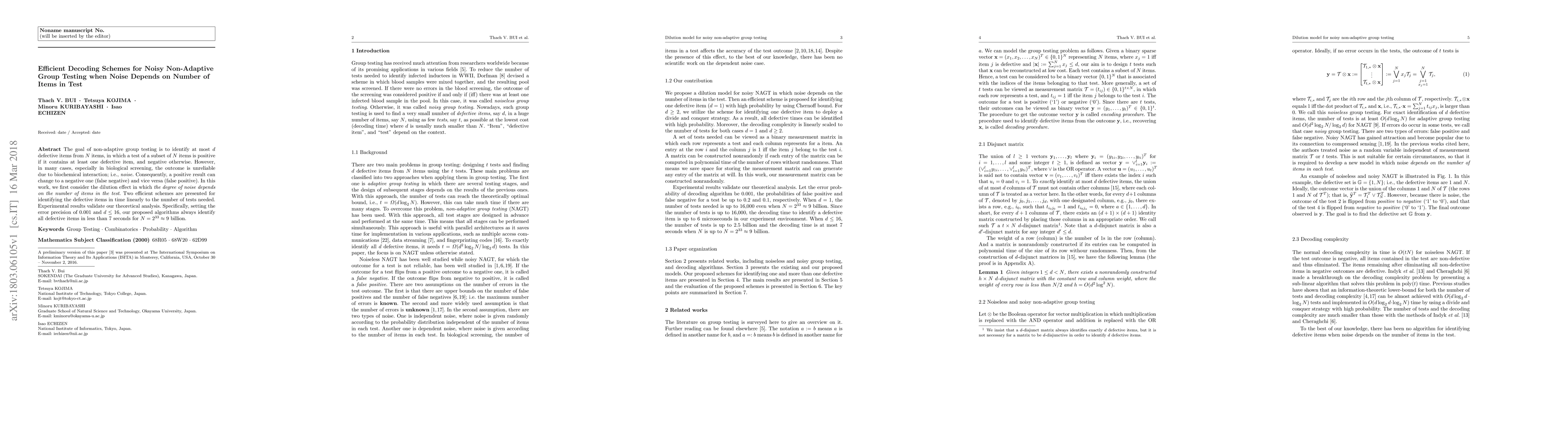 The goal of non-adaptive group testing is to identify at most $d$ defective items from $N$ items, in which a test of a subset of $N$ items is positive if it contains at least one defective item, and negative otherwise. However, in many cases, especially in biological screening, the outcome is unreliable due to biochemical interaction; i.e., \textit{noise.} Consequently, a positive result can change to a negative one (false negative) and vice versa (false positive). In this work, we first consider the dilution effect in which \textit{the degree of noise depends on the number of items in the test}. Two efficient schemes are presented for identifying the defective items in time linearly to the number of tests needed. Experimental results validate our theoretical analysis. Specifically, setting the error precision of 0.001 and $d\leq16$, our proposed algorithms always identify all defective items in less than 7 seconds for $N=2^{33}\approx 9$ billion.