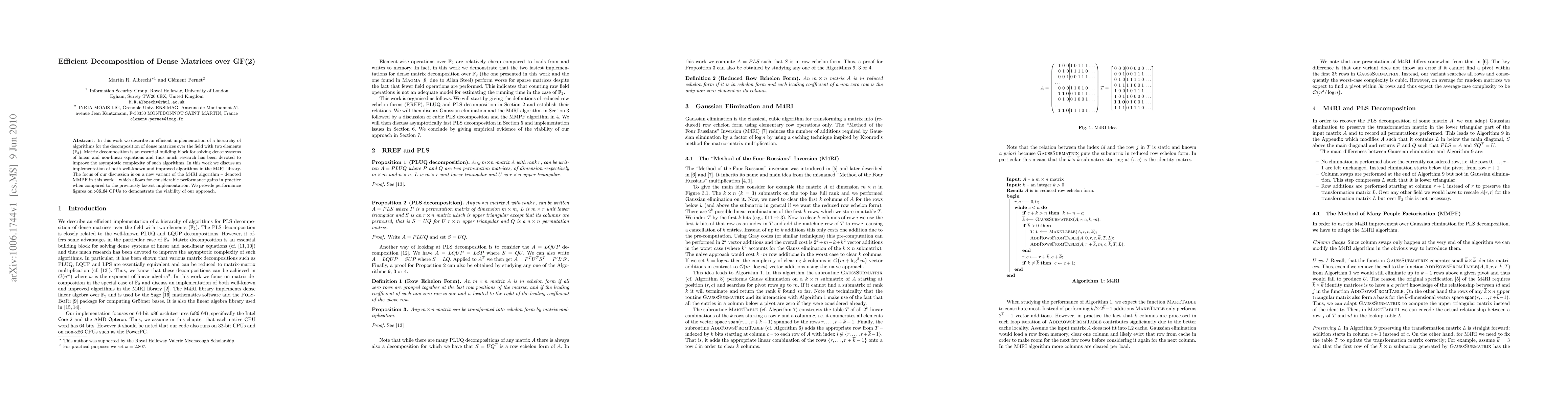 In this work we describe an efficient implementation of a hierarchy of algorithms for the decomposition of dense matrices over the field with two elements (GF(2)). Matrix decomposition is an essential building block for solving dense systems of linear and non-linear equations and thus much research has been devoted to improve the asymptotic complexity of such algorithms. In this work we discuss an implementation of both well-known and improved algorithms in the M4RI library. The focus of our discussion is on a new variant of the M4RI algorithm - denoted MMPF in this work -- which allows for considerable performance gains in practice when compared to the previously fastest implementation. We provide performance figures on x86_64 CPUs to demonstrate the viability of our approach.