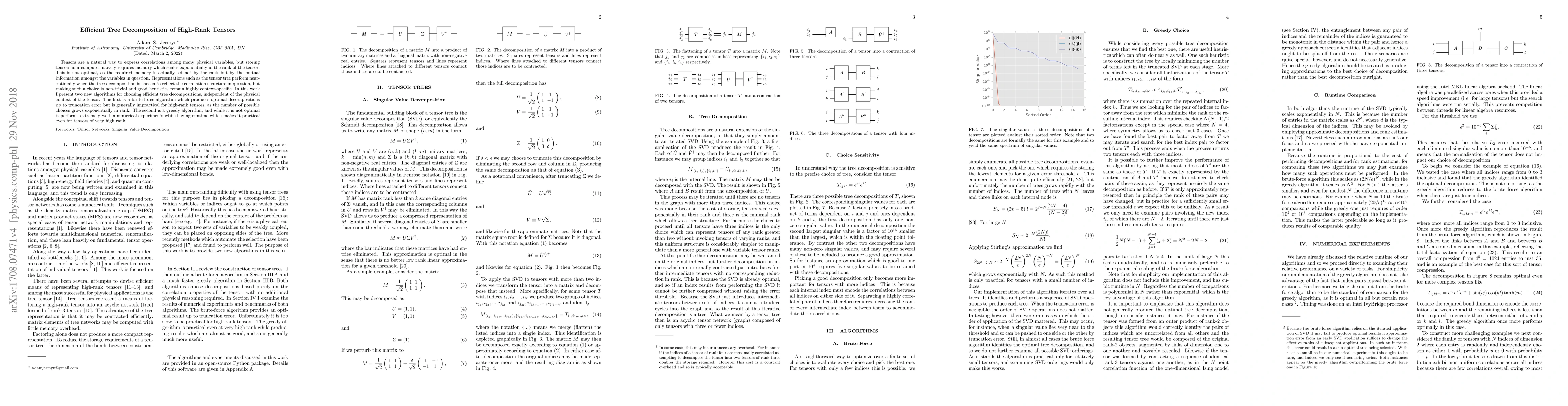This paper introduces two algorithms for efficiently decomposing high-rank tensors, aiming to reduce memory requirements beyond the naive rank-based approach. The first is an impractical brute-force method that finds optimal decompositions but is too costly for high-rank tensors. The second, a more practical greedy algorithm, offers near-optimal results with significantly lower computational cost.