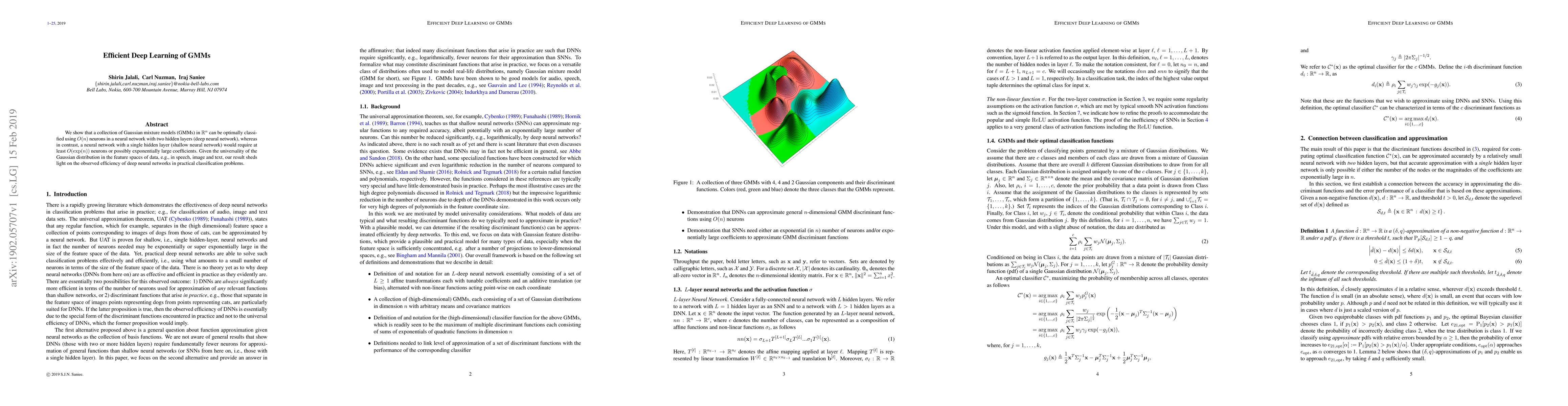 We show that a collection of Gaussian mixture models (GMMs) in $R^{n}$ can be optimally classified using $O(n)$ neurons in a neural network with two hidden layers (deep neural network), whereas in contrast, a neural network with a single hidden layer (shallow neural network) would require at least $O(\exp(n))$ neurons or possibly exponentially large coefficients. Given the universality of the Gaussian distribution in the feature spaces of data, e.g., in speech, image and text, our result sheds light on the observed efficiency of deep neural networks in practical classification problems.