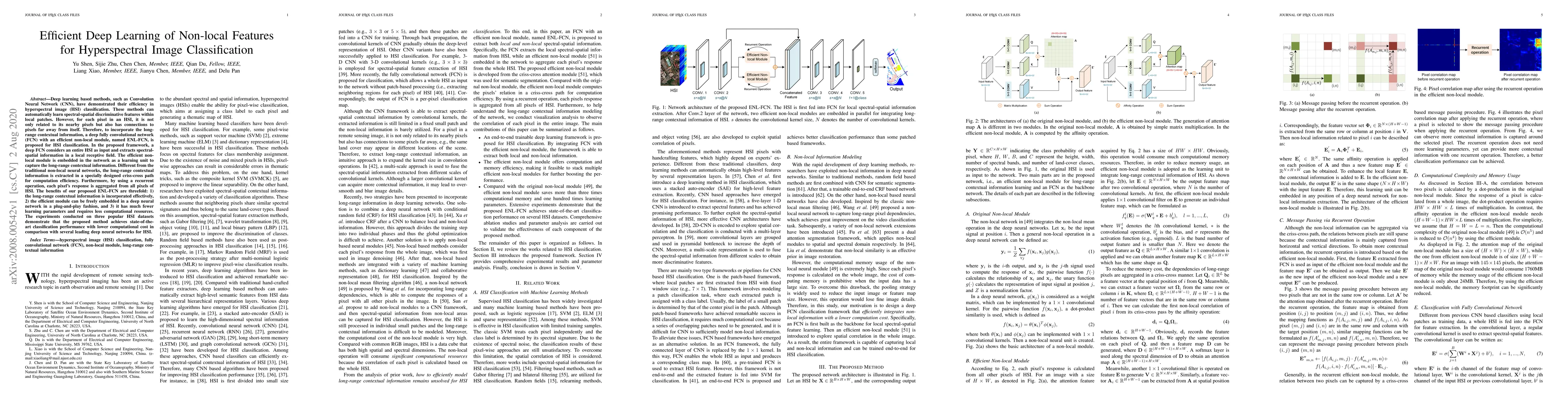 The paper proposes an efficient deep learning framework, ENL-FCN, incorporating an efficient non-local module to capture long-range contextual information for hyperspectral image classification. The method achieves state-of-the-art performance with lower computational costs compared to other deep learning models.