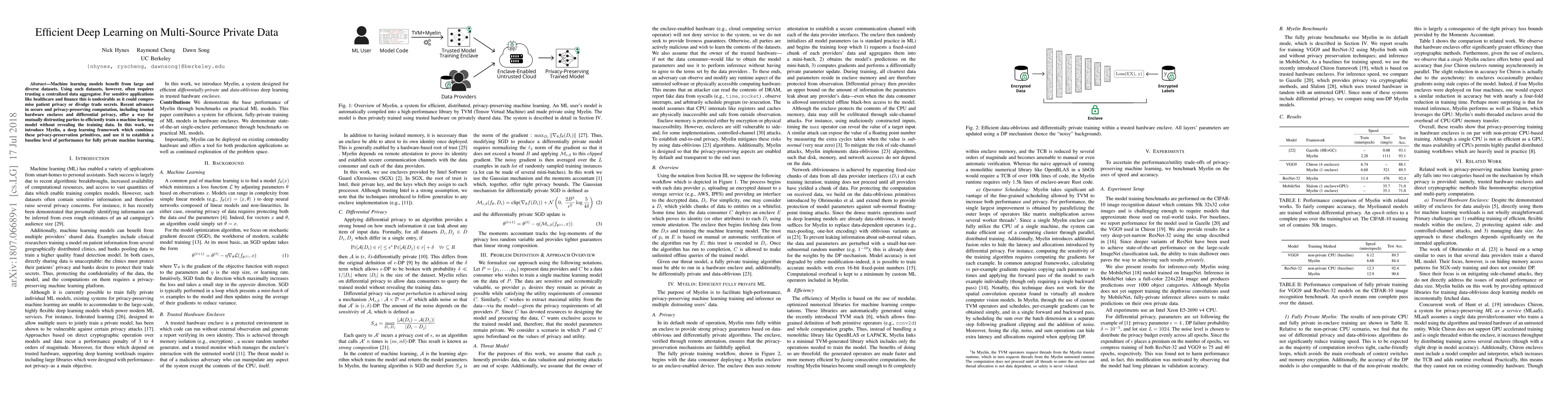 Machine learning models benefit from large and diverse datasets. Using such datasets, however, often requires trusting a centralized data aggregator. For sensitive applications like healthcare and finance this is undesirable as it could compromise patient privacy or divulge trade secrets. Recent advances in secure and privacy-preserving computation, including trusted hardware enclaves and differential privacy, offer a way for mutually distrusting parties to efficiently train a machine learning model without revealing the training data. In this work, we introduce Myelin, a deep learning framework which combines these privacy-preservation primitives, and use it to establish a baseline level of performance for fully private machine learning.