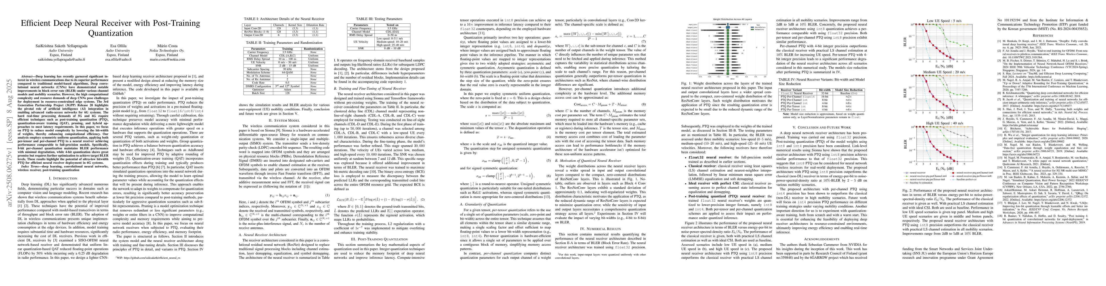 Deep learning has recently garnered significant interest in wireless communications due to its superior performance compared to traditional model-based algorithms. Deep convolutional neural networks (CNNs) have demonstrated notable improvements in block error rate (BLER) under various channel models and mobility scenarios. However, the high computational complexity and resource demands of deep CNNs pose challenges for deployment in resource-constrained edge systems. The 3rd Generation Partnership Project (3GPP) Release 20 highlights the pivotal role of artificial intelligence (AI) integration in enabling advanced radio-access networks for 6G systems. The hard real-time processing demands of 5G and 6G require efficient techniques such as post-training quantization (PTQ), quantization-aware training (QAT), pruning, and hybrid approaches to meet latency requirements. In this paper, we focus on PTQ to reduce model complexity by lowering the bit-width of weights, thereby enhancing computational efficiency. Our analysis employs symmetric uniform quantization, applying both per-tensor and per-channel PTQ to a neural receiver achieving performance comparable to full-precision models. Specifically, 8-bit per-channel quantization maintains BLER performance with minimal degradation, while 4-bit quantization shows great promise but requires further optimization to achieve target BLER levels. These results highlight the potential of ultra-low bitwidth PTQ for efficient neural receiver deployment in 6G systems.