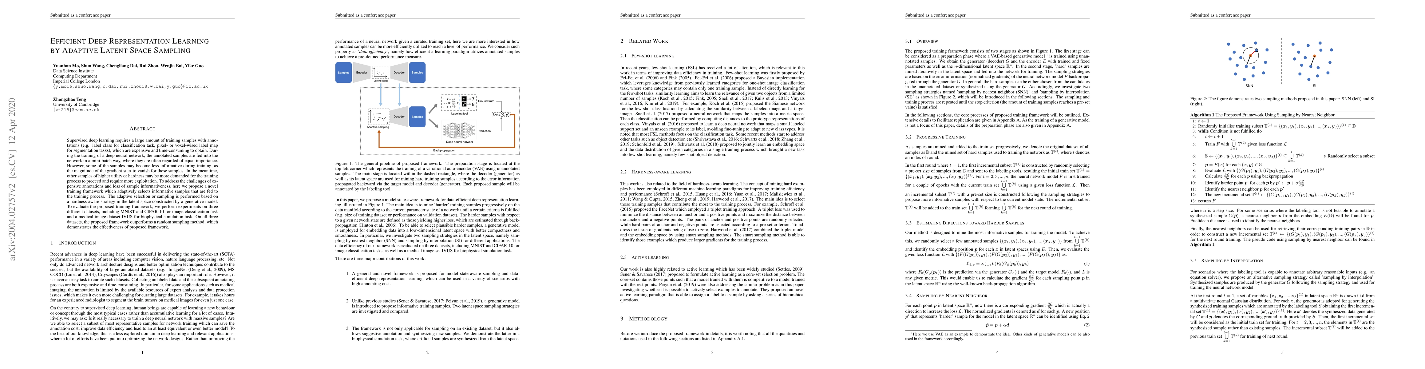 Supervised deep learning requires a large amount of training samples with annotations (e.g. label class for classification task, pixel- or voxel-wised label map for segmentation tasks), which are expensive and time-consuming to obtain. During the training of a deep neural network, the annotated samples are fed into the network in a mini-batch way, where they are often regarded of equal importance. However, some of the samples may become less informative during training, as the magnitude of the gradient start to vanish for these samples. In the meantime, other samples of higher utility or hardness may be more demanded for the training process to proceed and require more exploitation. To address the challenges of expensive annotations and loss of sample informativeness, here we propose a novel training framework which adaptively selects informative samples that are fed to the training process. The adaptive selection or sampling is performed based on a hardness-aware strategy in the latent space constructed by a generative model. To evaluate the proposed training framework, we perform experiments on three different datasets, including MNIST and CIFAR-10 for image classification task and a medical image dataset IVUS for biophysical simulation task. On all three datasets, the proposed framework outperforms a random sampling method, which demonstrates the effectiveness of proposed framework.