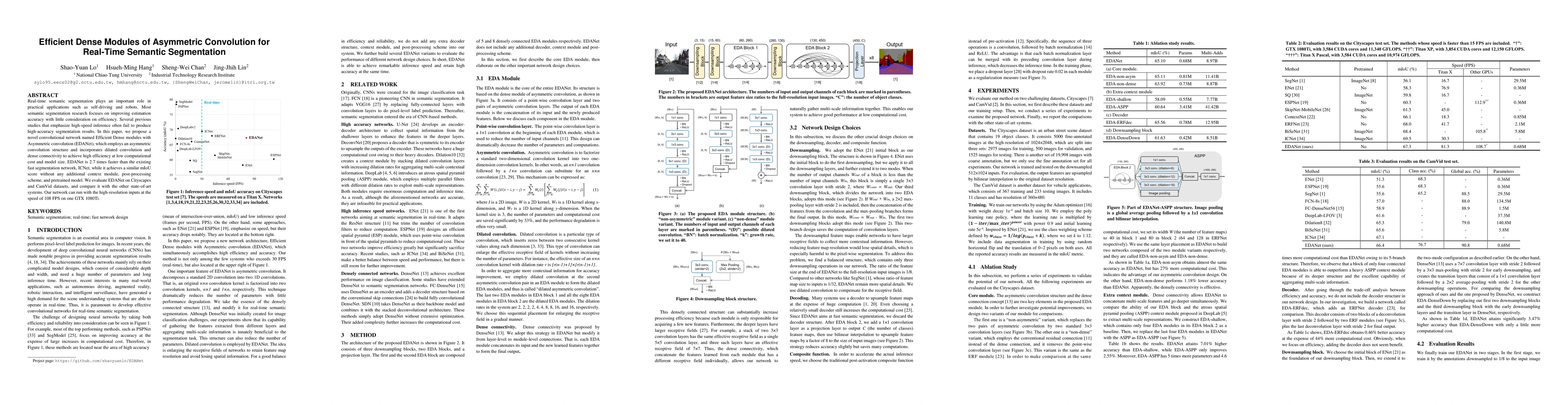 This paper introduces EDANet, a novel convolutional network utilizing asymmetric convolution, dilated convolution, and dense connectivity to achieve real-time semantic segmentation with high efficiency and comparable accuracy. EDANet outperforms existing fast networks like ICNet by 2.7 times while maintaining similar mIoU scores, demonstrating high-resolution processing at 108 FPS on a GTX 1080Ti.