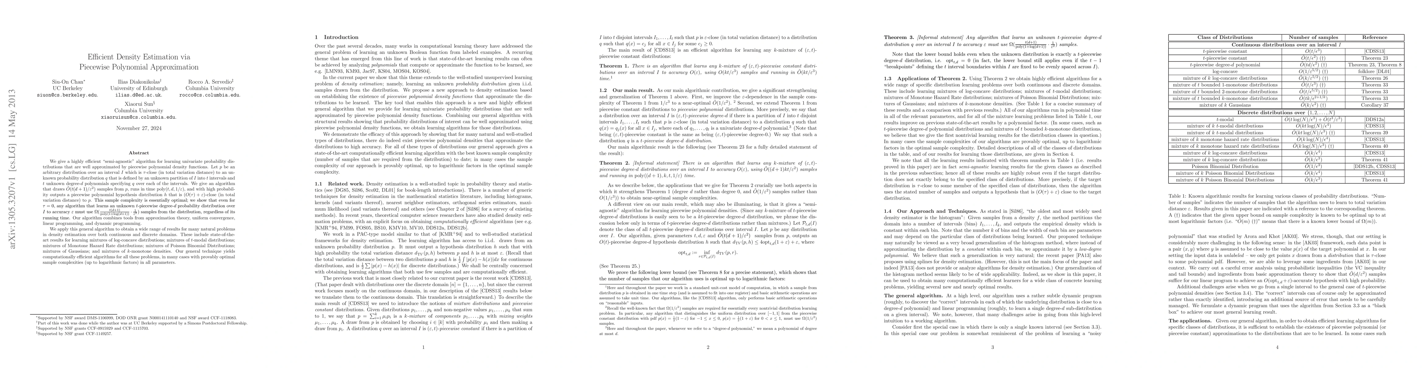 This paper presents an efficient algorithm for learning univariate probability distributions approximated by piecewise polynomial functions. The algorithm achieves optimal sample complexity and runs in polynomial time, applying to various density estimation problems including mixtures of log-concave, Gaussian, and other distributions.