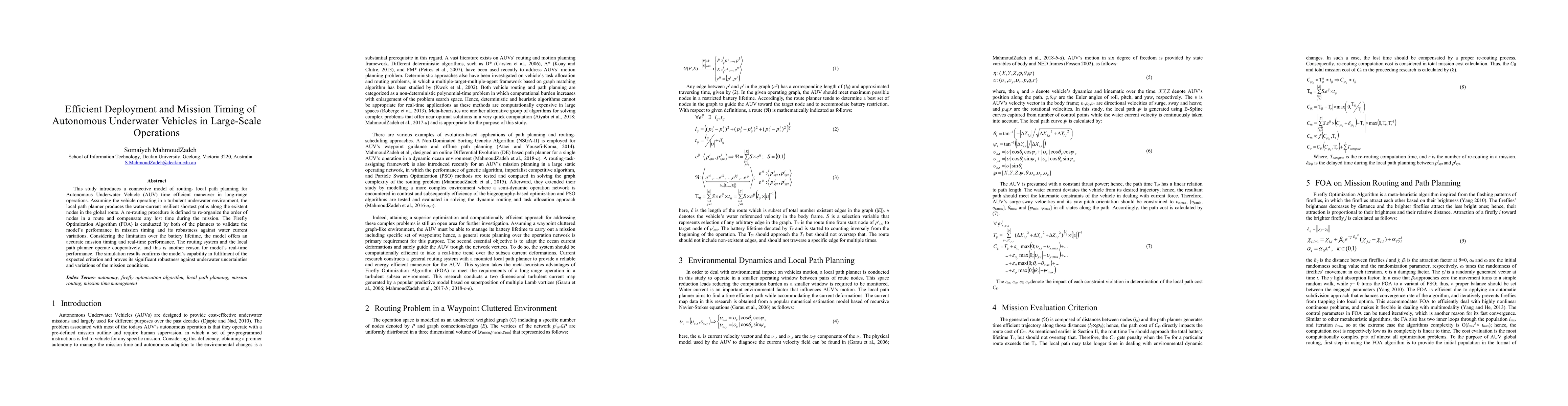 This study introduces a connective model of routing -- local path planning for Autonomous Underwater Vehicle (AUV) time efficient maneuver in long-range operations. Assuming the vehicle operating in a turbulent underwater environment, the local path planner produces the water-current resilient shortest paths along the existent nodes in the global route. A re-routing procedure is defined to re-organize the order of nodes in a route and compensate any lost time during the mission. The Firefly Optimization Algorithm (FOA) is conducted by both of the planners to validate the model's performance in mission timing and its robustness against water current variations. Considering the limitation over the battery life time, the model offers an accurate mission timing and real-time performance. The routing system and the local path planner operate cooperatively, and this is another reason for model's real-time performance. The simulation results confirms the model's capability in fulfillment of the expected criterion and proves its significant robustness against underwater uncertainties and variations of the mission conditions.