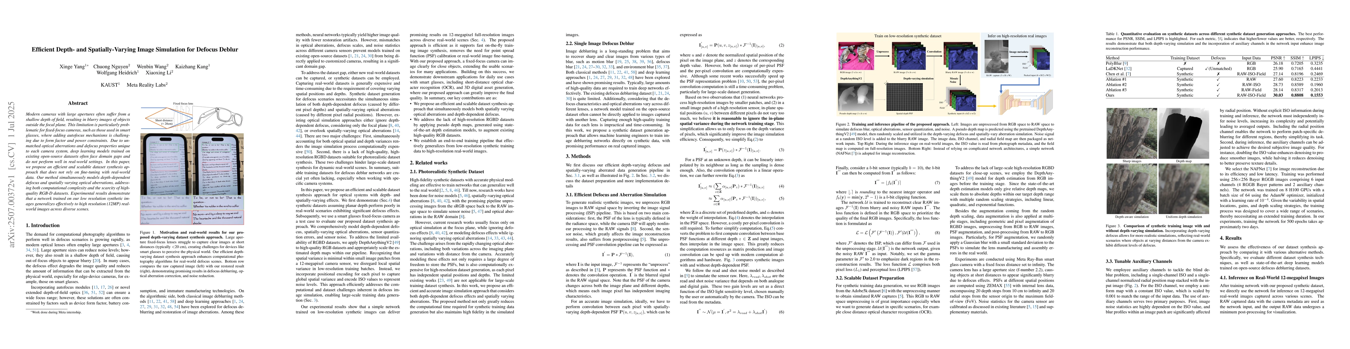 Modern cameras with large apertures often suffer from a shallow depth of field, resulting in blurry images of objects outside the focal plane. This limitation is particularly problematic for fixed-focus cameras, such as those used in smart glasses, where adding autofocus mechanisms is challenging due to form factor and power constraints. Due to unmatched optical aberrations and defocus properties unique to each camera system, deep learning models trained on existing open-source datasets often face domain gaps and do not perform well in real-world settings. In this paper, we propose an efficient and scalable dataset synthesis approach that does not rely on fine-tuning with real-world data. Our method simultaneously models depth-dependent defocus and spatially varying optical aberrations, addressing both computational complexity and the scarcity of high-quality RGB-D datasets. Experimental results demonstrate that a network trained on our low resolution synthetic images generalizes effectively to high resolution (12MP) real-world images across diverse scenes.