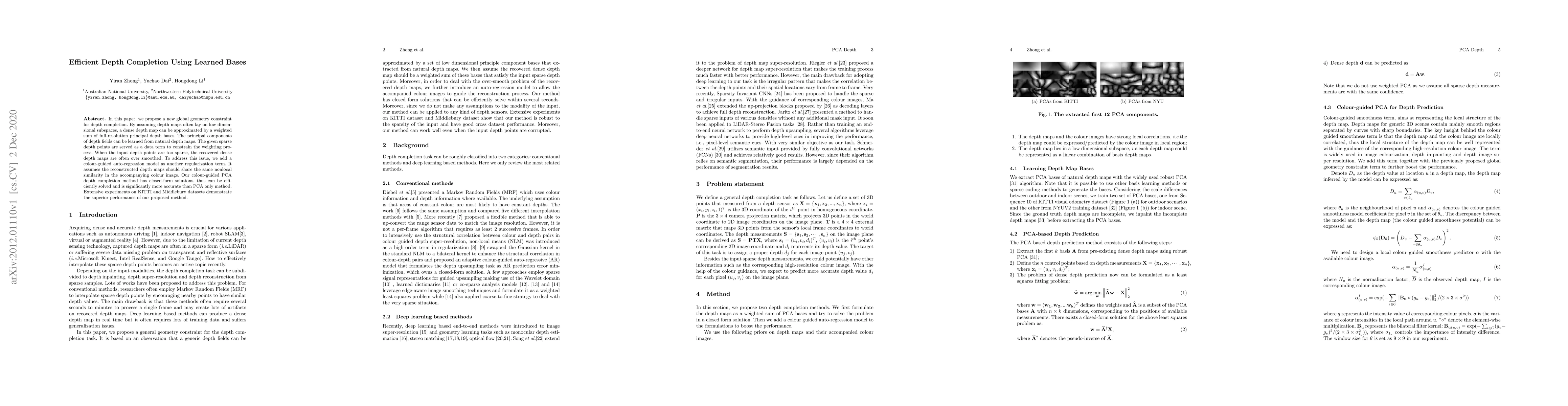 This paper proposes a new method for depth completion that uses learned principal component analysis (PCA) bases to efficiently estimate dense depth maps from sparse points. The proposed method outperforms existing methods in extensive experiments on KITTI and Middlebury datasets.