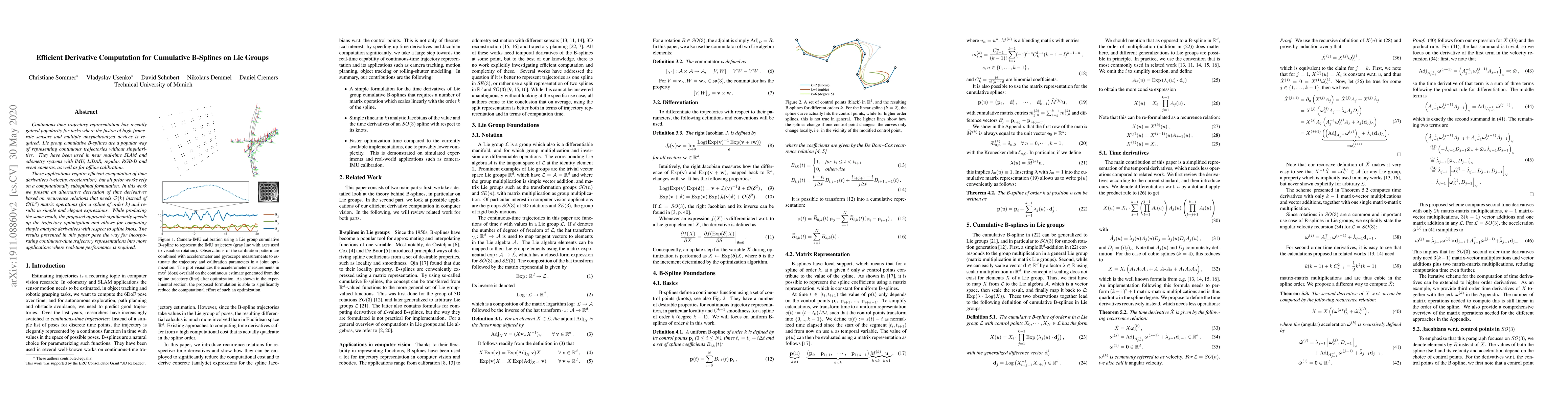 The research presents an alternative derivation of time derivatives for Lie group cumulative B-splines using recurrence relations, reducing computational complexity from O(k^2) to O(k).