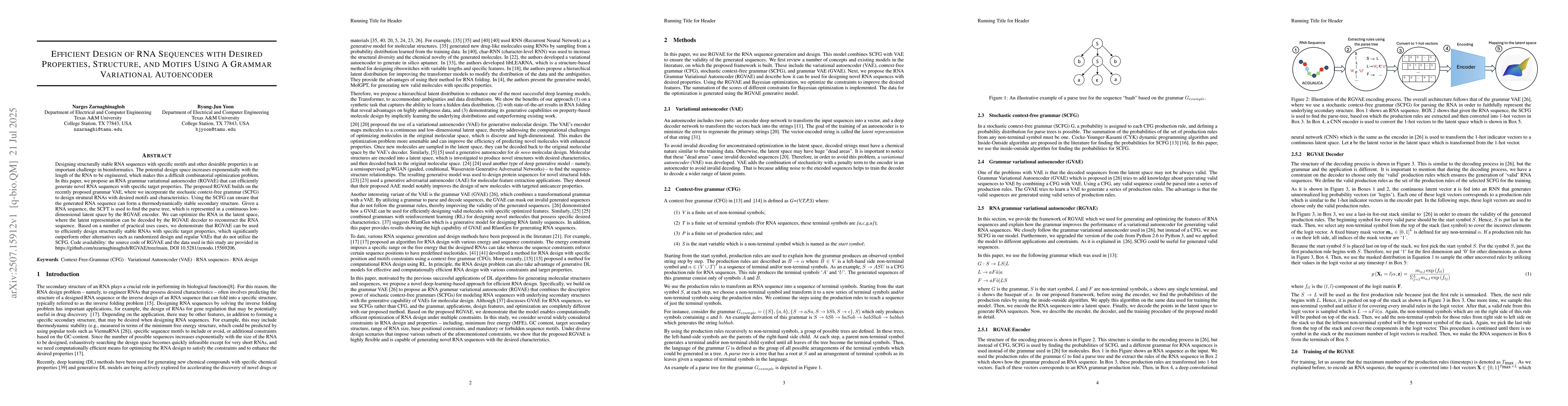 Designing structurally stable RNA sequences with specific motifs and other desirable properties is an important challenge in bioinformatics. The potential design space increases exponentially with the length of the RNA to be engineered, which makes this a difficult combinatorial optimization problem. In this paper, we propose an RNA grammar variational autoencoder (RGVAE) that can efficiently generate novel RNA sequences with specific target properties. The proposed RGVAE builds on the recently proposed grammar VAE, where we incorporate the stochastic context-free grammar (SCFG) to design strutural RNAs with desired motifs and characteristics. Using the SCFG can ensure that the generated RNA sequence can form a thermodynamically stable secondary structure. Given a RNA sequence, the SCFT is used to find the parse tree, which is represented in a continuous low-dimensional latent space by the RGVAE encoder. We can optimize the RNA in the latent space, where the latent representation can be decoded by the RGVAE decoder to reconstruct the RNA sequence. Based on a number of practical uses cases, we demonstrate that RGVAE can be used to efficiently design structurally stable RNAs with specific target properties, which significantly outperform other alternatives such as randomized design and regular VAEs that do not utilize the SCFG. Code availability: the source code of RGVAE and the data used in this study are provided in https://github.com/nzarnaghinaghsh/RGVAE/tree/main, DOI 10.5281/zenodo.15569206.
