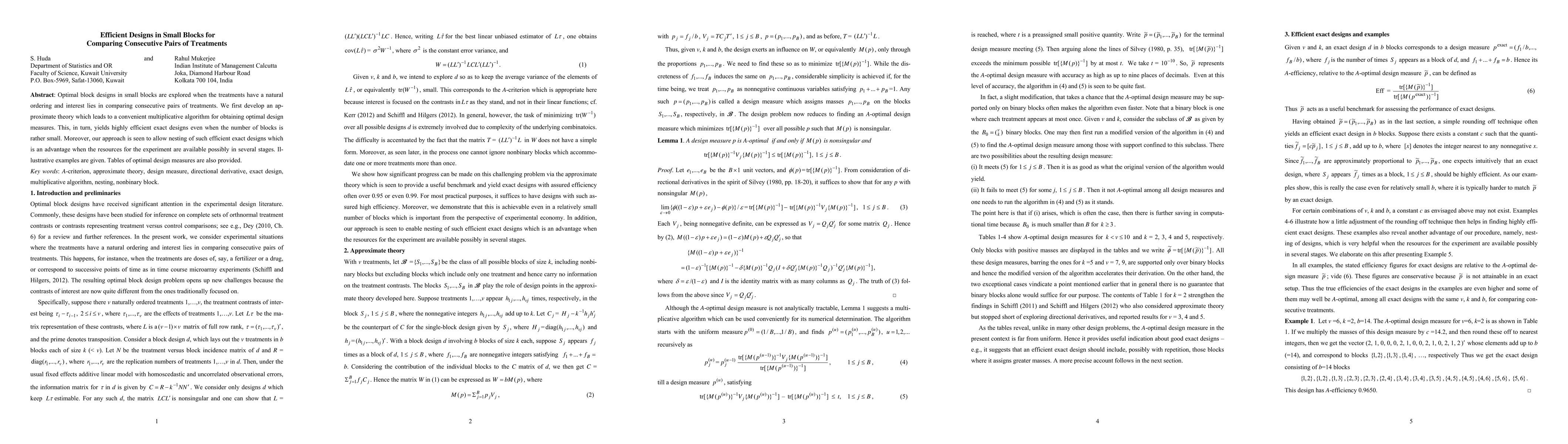 This paper explores optimal block designs for small blocks to compare consecutive pairs of treatments in ordered sets, presenting an approximate theory and a multiplicative algorithm for efficient design measures. The method yields highly efficient exact designs, even with limited blocks, and supports nesting of designs for multi-stage experiments.