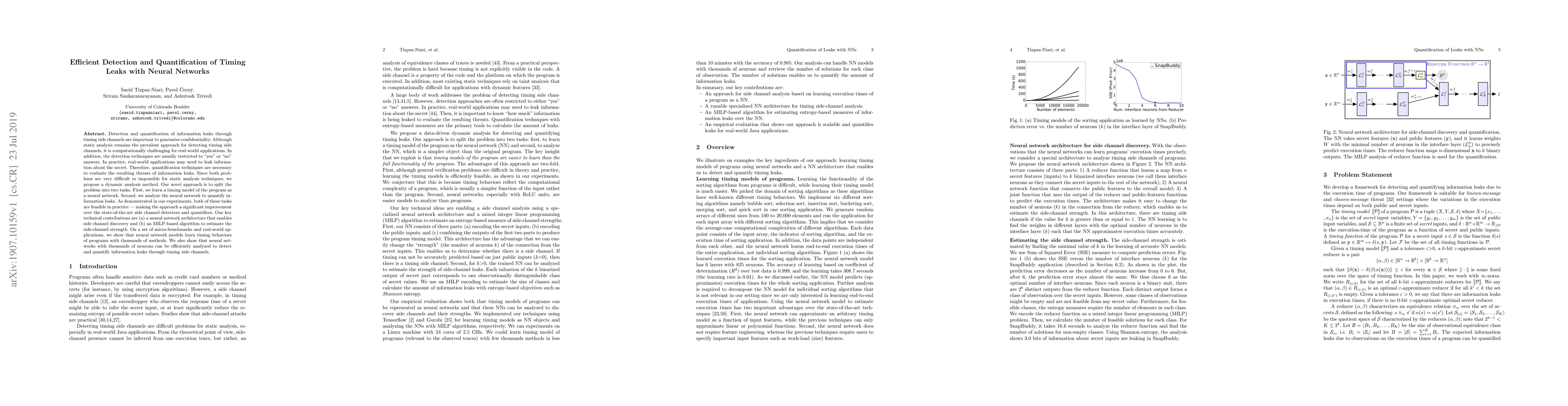 This paper proposes a dynamic analysis method using neural networks to detect and quantify timing leaks in programs, addressing the limitations of static analysis. It introduces a neural network architecture for side channel discovery and an MILP-based algorithm for quantifying leaks, demonstrating significant improvements over existing detectors and quantifiers.