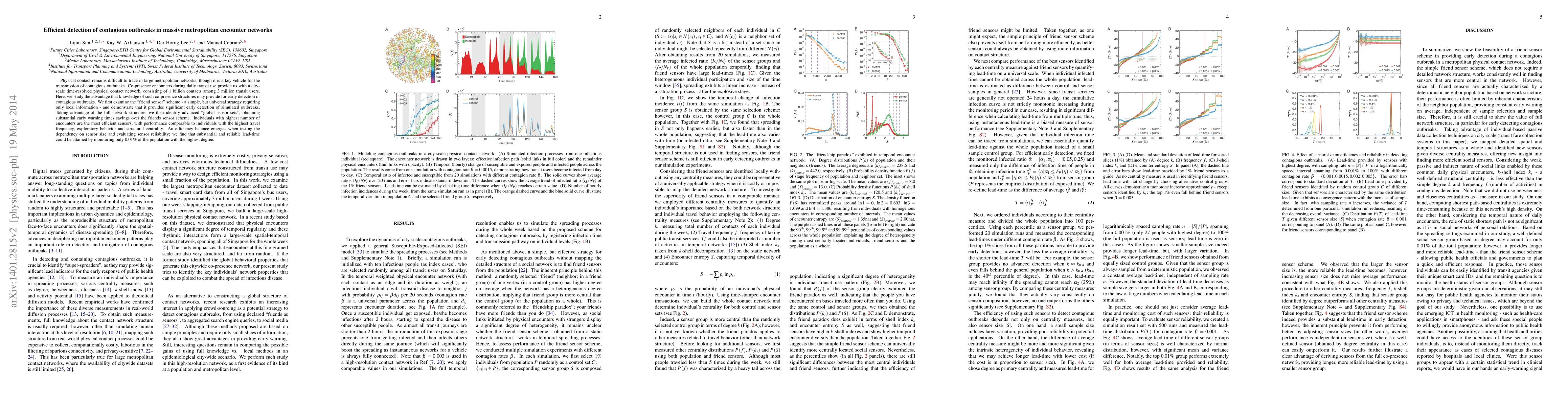 This paper explores efficient detection of contagious outbreaks using co-presence encounters in massive metropolitan networks. It demonstrates that monitoring individuals with the highest number of encounters can significantly enhance early detection, achieving comparable performance to more resource-intensive methods, while requiring only 0.01% of the population to be monitored.