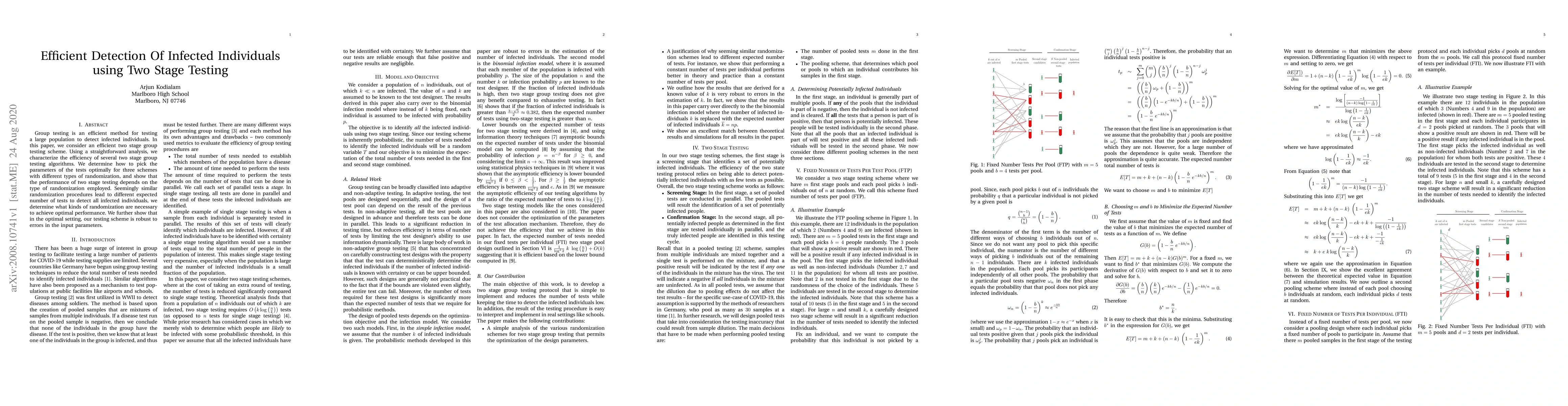 This paper proposes an adaptive two-stage group testing scheme to efficiently detect infected individuals in large populations. It analyzes various algorithms and determines optimal parameters for three randomization schemes, showing that different randomizations yield different test efficiencies and robustness to parameter errors.
