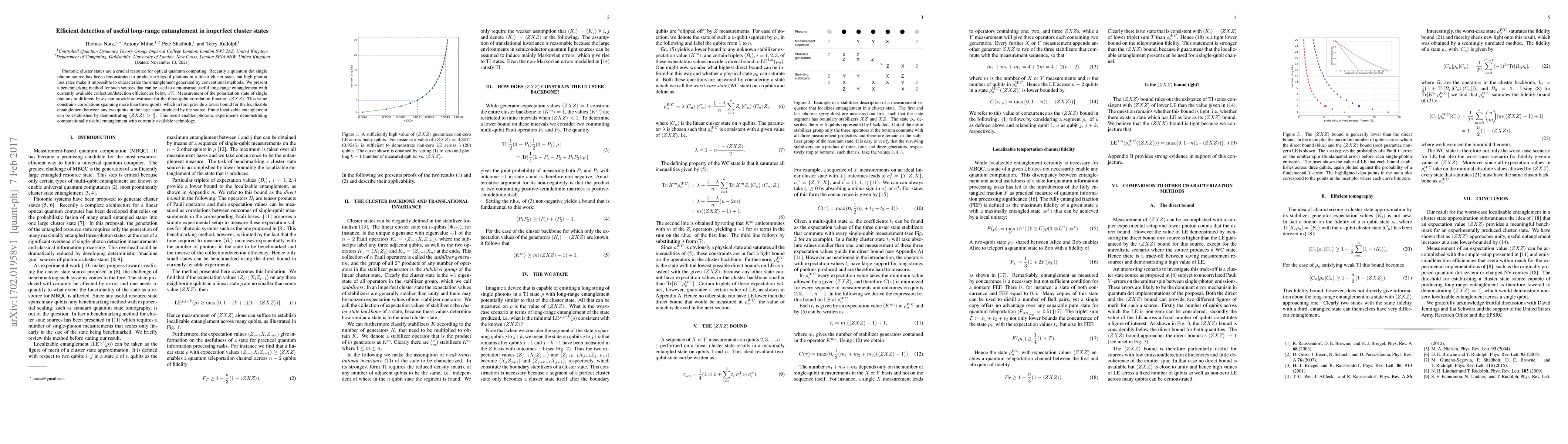 This paper introduces a method to detect useful long-range entanglement in imperfect cluster states, enabling photonic experiments with currently available technology. By measuring the polarization state of single photons, it's possible to estimate correlations that constrain localizable entanglement between two qubits.