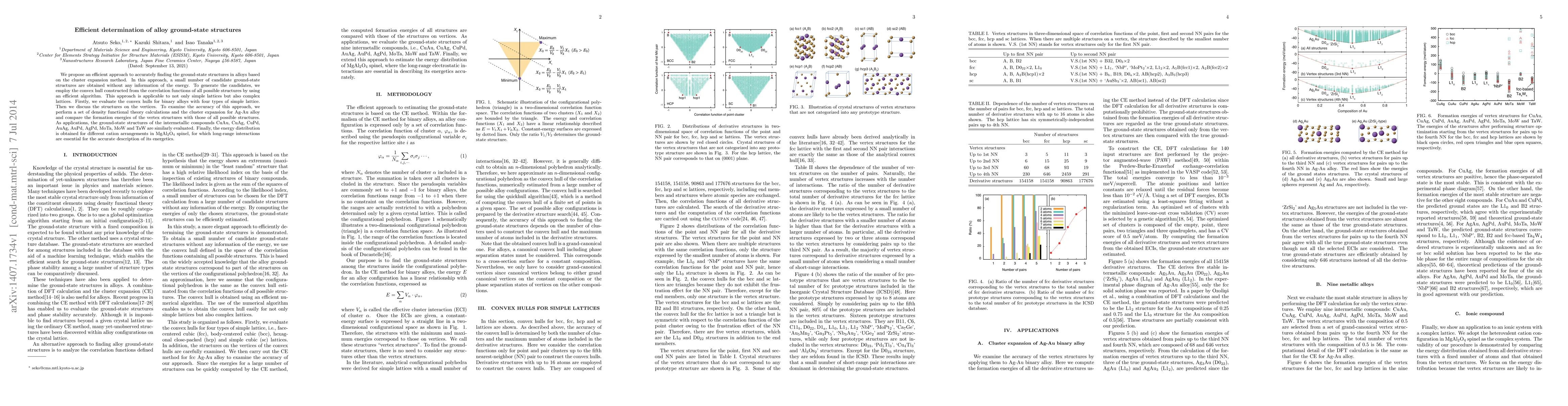 We propose an efficient approach to accurately finding the ground-state structures in alloys based on the cluster expansion method. In this approach, a small number of candidate ground-state structures are obtained without any information of the energy. To generate the candidates, we employ the convex hull constructed from the correlation functions of all possible structures by using an efficient algorithm. This approach is applicable to not only simple lattices but also complex lattices. Firstly, we evaluate the convex hulls for binary alloys with four types of simple lattice. Then we discuss the structures on the vertices. To examine the accuracy of this approach, we perform a set of density functional theory calculations and the cluster expansion for Ag-Au alloy and compare the formation energies of the vertex structures with those of all possible structures. As applications, the ground-state structures of the intermetallic compounds CuAu, CuAg, CuPd, AuAg, AuPd, AgPd, MoTa, MoW and TaW are similarly evaluated. Finally, the energy distribution is obtained for different cation arrangements in MgAl$_2$O$_4$ spinel, for which long-range interactions are essential for the accurate description of its energetics.