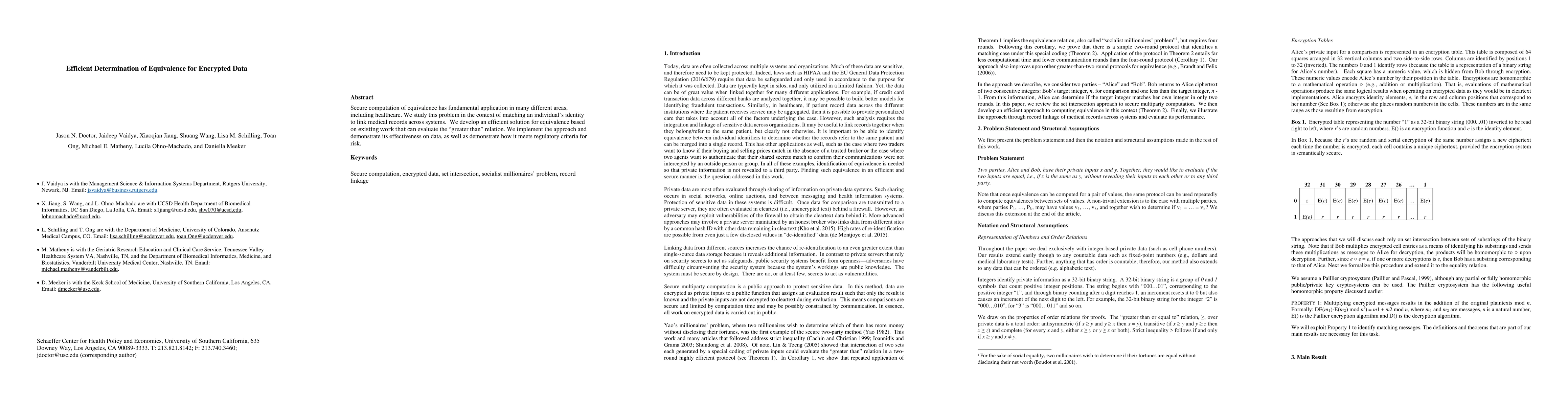 Secure computation of equivalence has fundamental application in many different areas, including healthcare. We study this problem in the context of matching an individual identity to link medical records across systems. We develop an efficient solution for equivalence based on existing work that can evaluate the greater than relation. We implement the approach and demonstrate its effectiveness on data, as well as demonstrate how it meets regulatory criteria for risk.