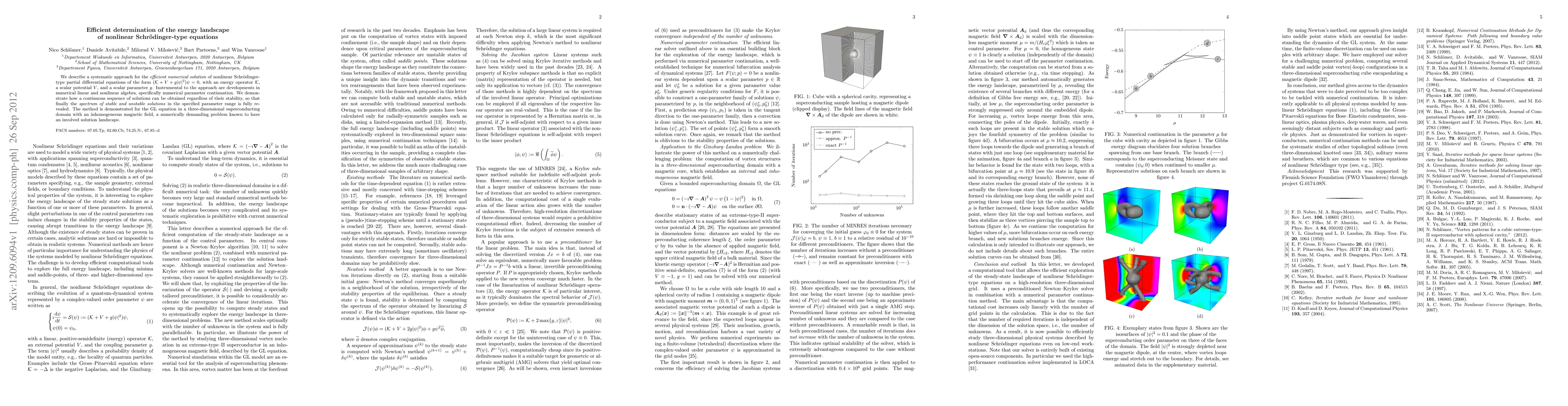 We describe a systematic approach for the efficient numerical solution of nonlinear Schr\"odinger-type partial differential equations of the form $(K +V + g|\psi|^2)\psi=0$, with an energy operator $K$, a scalar potential $V$, and a scalar parameter $g$. Instrumental to the approach are developments in numerical linear and nonlinear algebra, specifically numerical parameter continuation. We demonstrate how a continuous sequence of solutions can be obtained regardless of their stability, so that finally the spectrum of stable and unstable solutions in the specified parameter range is fully revealed. The method is demonstrated for the GL equation in a three-dimensional superconducting domain with an inhomogeneous magnetic field, a numerically demanding problem known to have an involved solution landscape.
