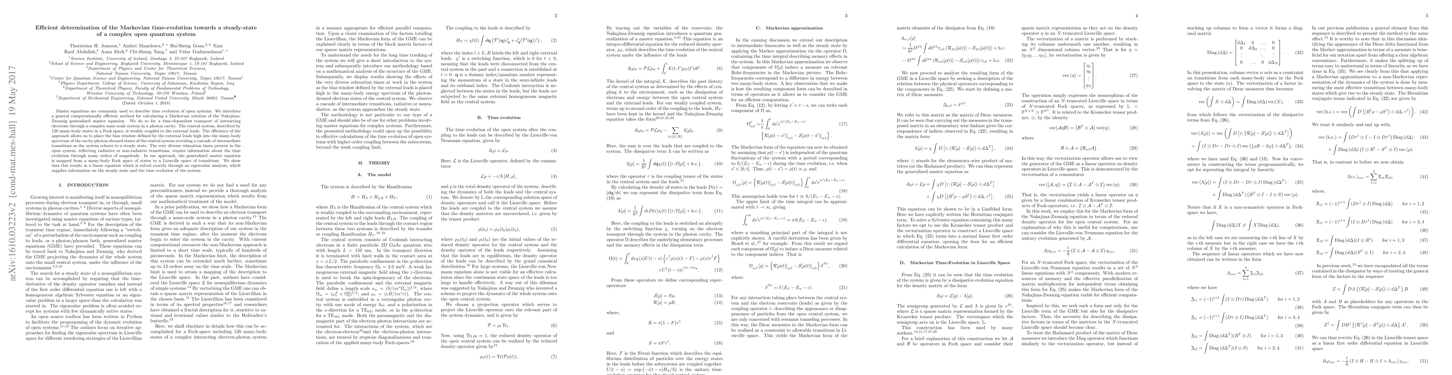 Master equations are commonly used to describe time evolution of open systems. We introduce a general method for calculating a Markovian solution of the Nakajima-Zwanzig generalized master equation. We do so for a time dependent transport of interacting electrons through a complex nano scale system in a photon cavity. The central system, described by 120 many-body states in a Fock space, is weakly coupled to the external leads. The very diverse relaxation times of the open system, reflecting radiative or non-radiative transitions, require information about the time evolution through many orders of magnitude. In our approach, the generalized master equation is mapped from a many-body Fock space of states to a Liouville space of transitions. We show that this results in a linear equation which is solved exactly through an eigenvalue analysis, which supplies information on the steady state and the time evolution of the system.