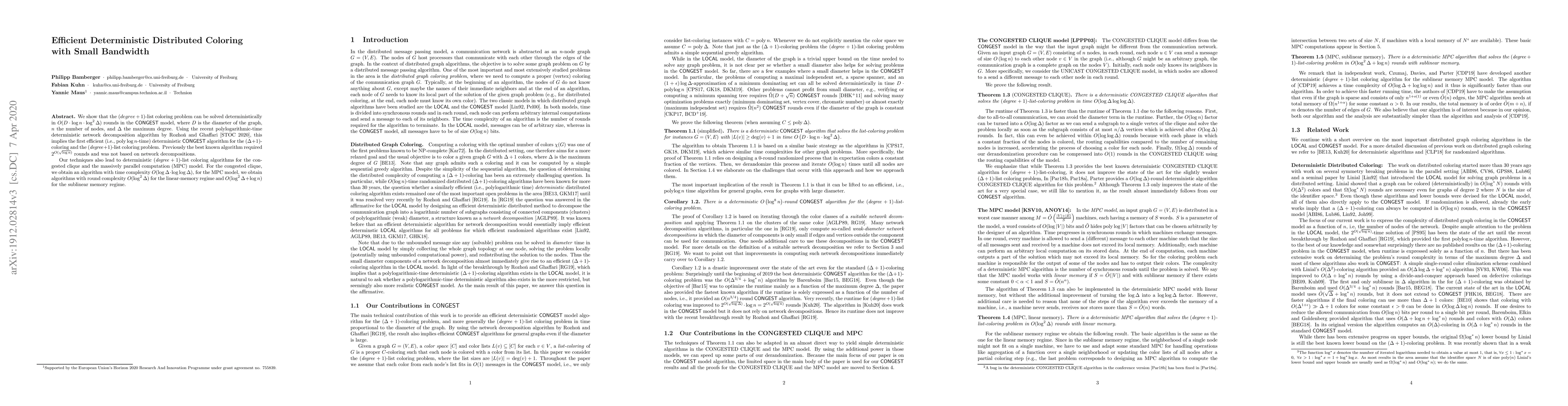 The research employs a deterministic distributed algorithm approach, utilizing network decomposition techniques and a CONGEST model for efficient distributed coloring with small bandwidth. It also extends the algorithm to the congested clique and MPC models.