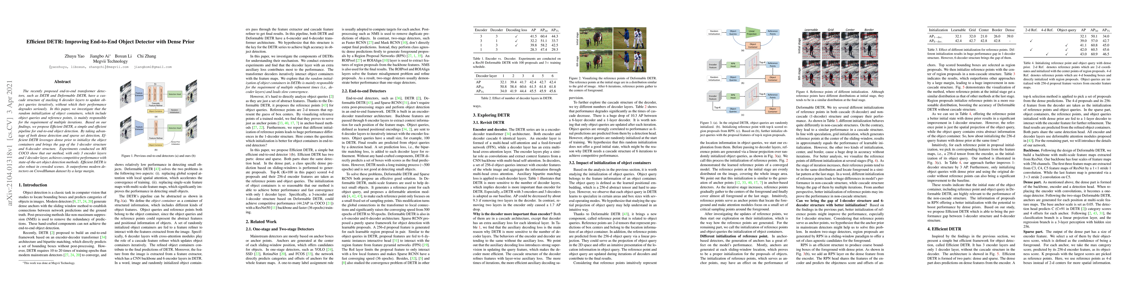 This paper proposes Efficient DETR, an improved end-to-end object detector that leverages dense prior to initialize object containers, reducing the need for multiple decoder iterations. Experiments show it achieves competitive performance with fewer layers compared to traditional DETR.