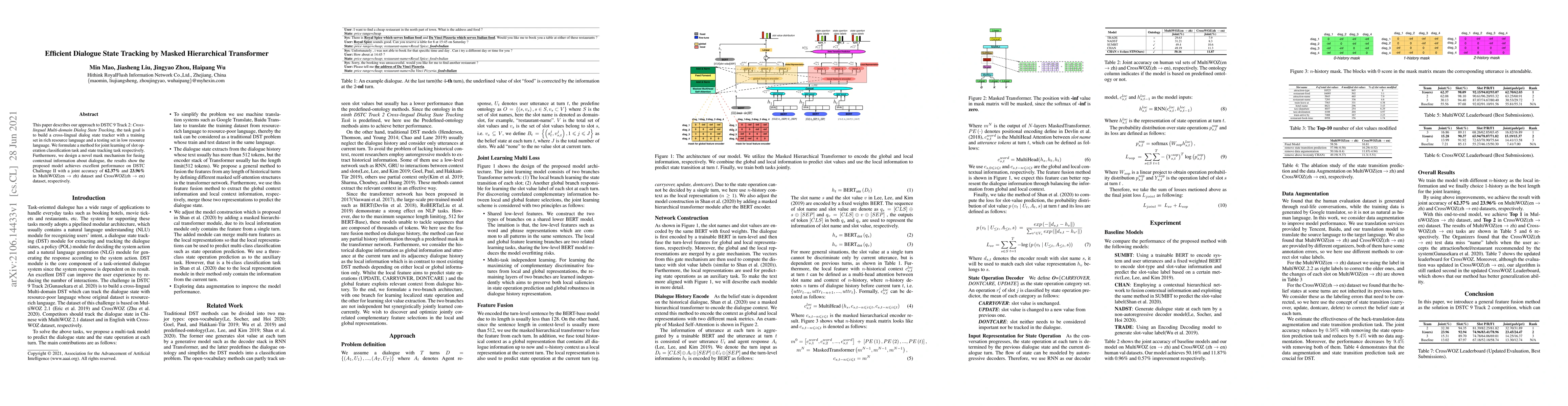 This paper proposes a masked hierarchical transformer for efficient cross-lingual multi-domain dialog state tracking, achieving high joint accuracy on DSTC Challenge II datasets, demonstrating the effectiveness of joint learning and contextual fusion. The model shows significant performance in both MultiWOZ and CrossWOZ datasets.