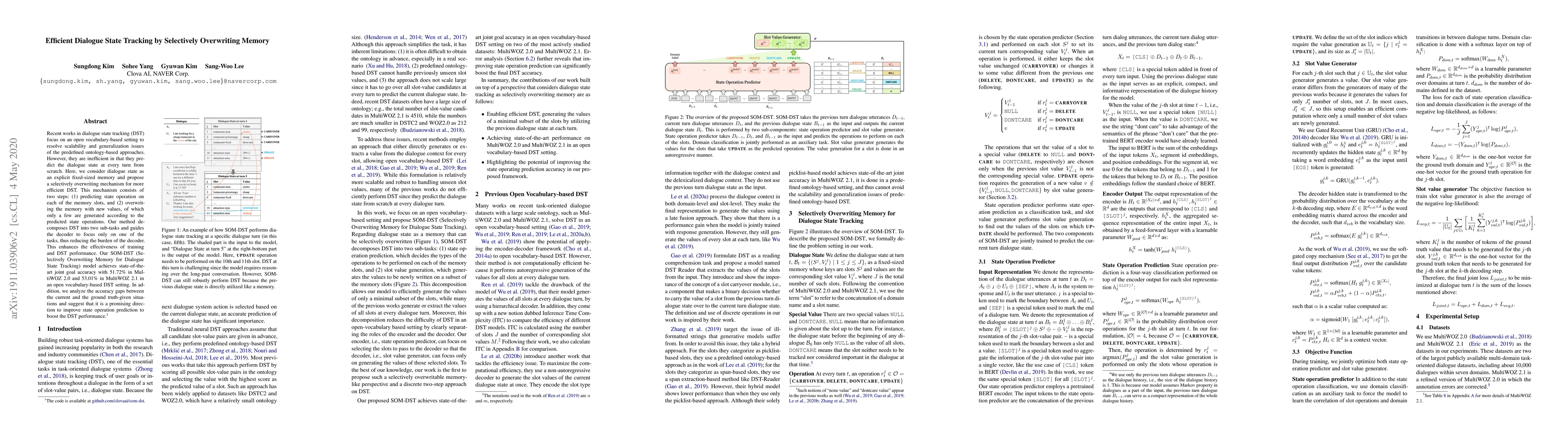 Recent works in dialogue state tracking (DST) focus on an open vocabulary-based setting to resolve scalability and generalization issues of the predefined ontology-based approaches. However, they are inefficient in that they predict the dialogue state at every turn from scratch. Here, we consider dialogue state as an explicit fixed-sized memory and propose a selectively overwriting mechanism for more efficient DST. This mechanism consists of two steps: (1) predicting state operation on each of the memory slots, and (2) overwriting the memory with new values, of which only a few are generated according to the predicted state operations. Our method decomposes DST into two sub-tasks and guides the decoder to focus only on one of the tasks, thus reducing the burden of the decoder. This enhances the effectiveness of training and DST performance. Our SOM-DST (Selectively Overwriting Memory for Dialogue State Tracking) model achieves state-of-the-art joint goal accuracy with 51.72% in MultiWOZ 2.0 and 53.01% in MultiWOZ 2.1 in an open vocabulary-based DST setting. In addition, we analyze the accuracy gaps between the current and the ground truth-given situations and suggest that it is a promising direction to improve state operation prediction to boost the DST performance.