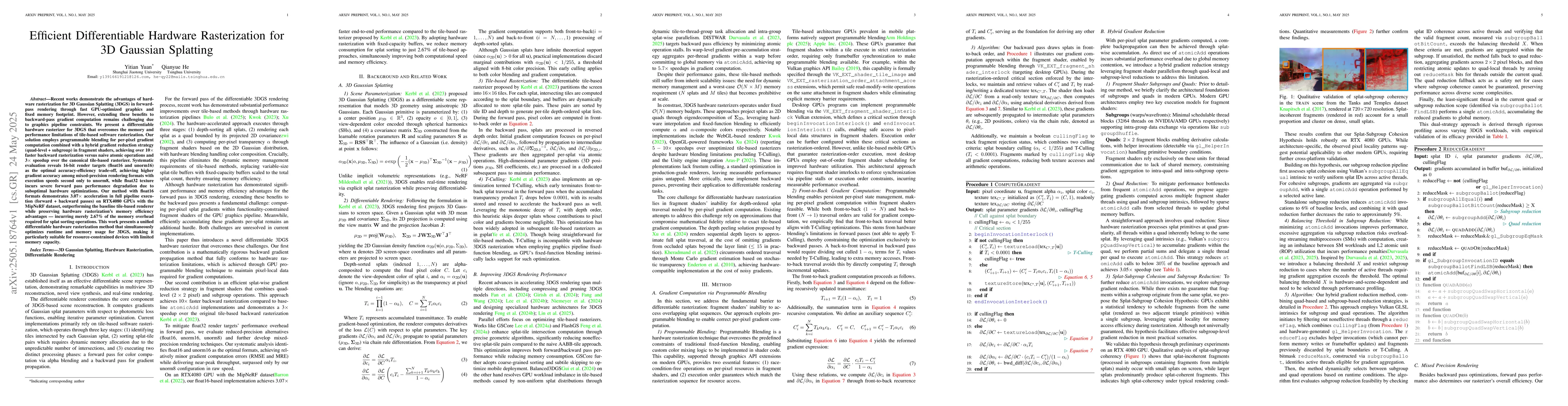 The research presents a differentiable hardware rasterizer for 3D Gaussian Splatting (3DGS) that utilizes programmable blending for per-pixel gradient computation and a hybrid gradient reduction strategy (quad-level + subgroup) in fragment shaders.