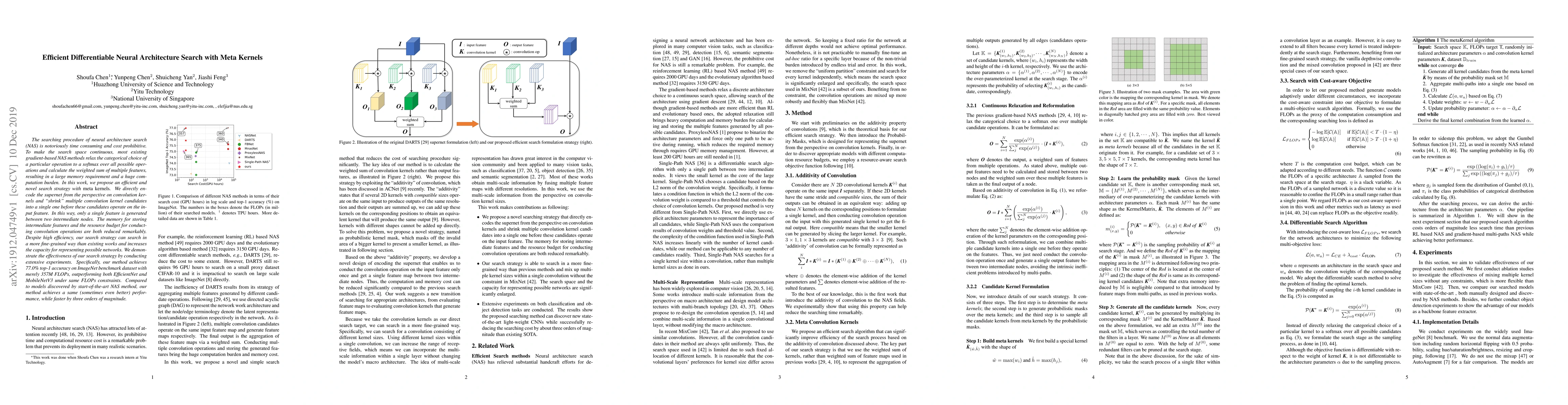 This paper proposes an efficient differentiable neural architecture search strategy using meta kernels, which reduces memory and computational costs by shrinking convolution kernel candidates into a single kernel. The method achieves high accuracy on ImageNet with significantly lower FLOPs, outperforming EfficientNet and MobileNetV3, and is three orders of magnitude faster than state-of-the-art NAS methods.